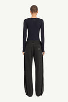Questi jeans, realizzati con una tecnica a pannelli ridotti, conservano il tessuto in eccesso per rivelare la loro trasformazione. I pannelli laterali interni a vista esasperano il volume pur mantenendo la classica struttura a cinque tasche. Sul retro, la linea di impunture bianche MM6 afferma l’identità del marchio.