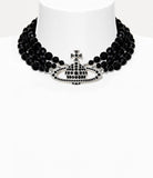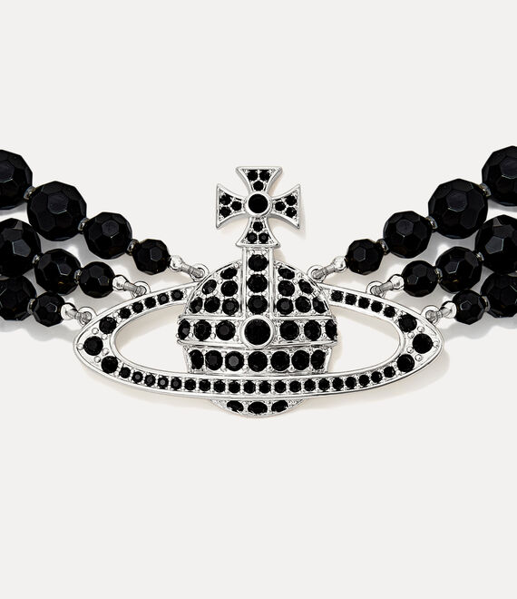 Il choker Messaline Three Row si distingue per i cristalli di agata nera abilmente sfaccettati e annodati a mano. L’iconico gioiello è impreziosito da un pendente Orb con giaietto, omaggio all’estetica di Vivienne, sempre tesa a rivoluzionare creativamente la tradizione.