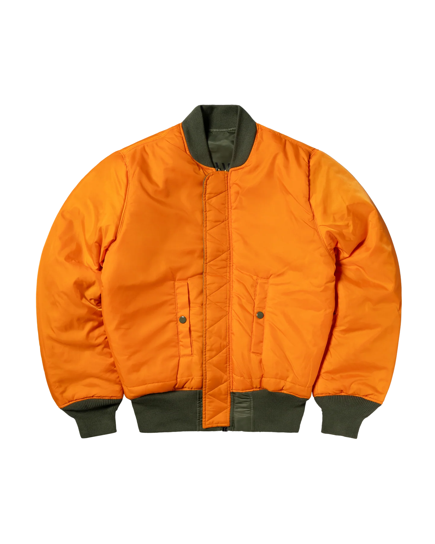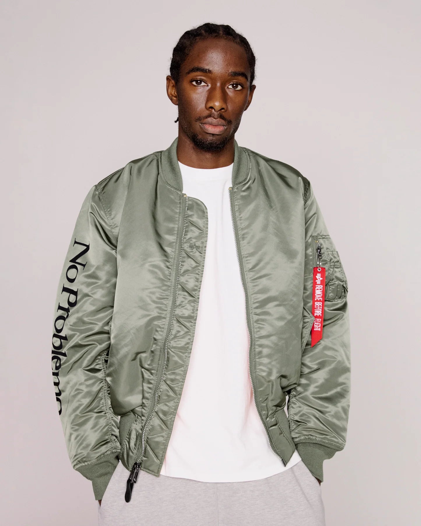 LA COLLABORAZIONE È COSTRUITA SULLA SILHOUETTE ORIGINALE MA-1 DI ALPHA, FILTRATA ATTRAVERSO L'OBIETTIVO IRREVERENTE DI NO PROBLEMO.