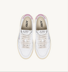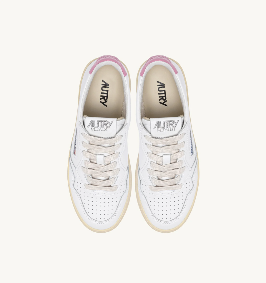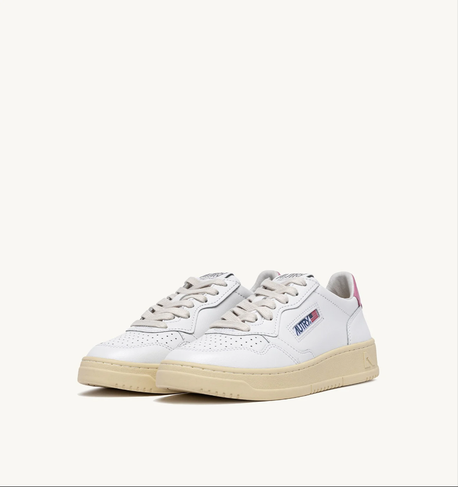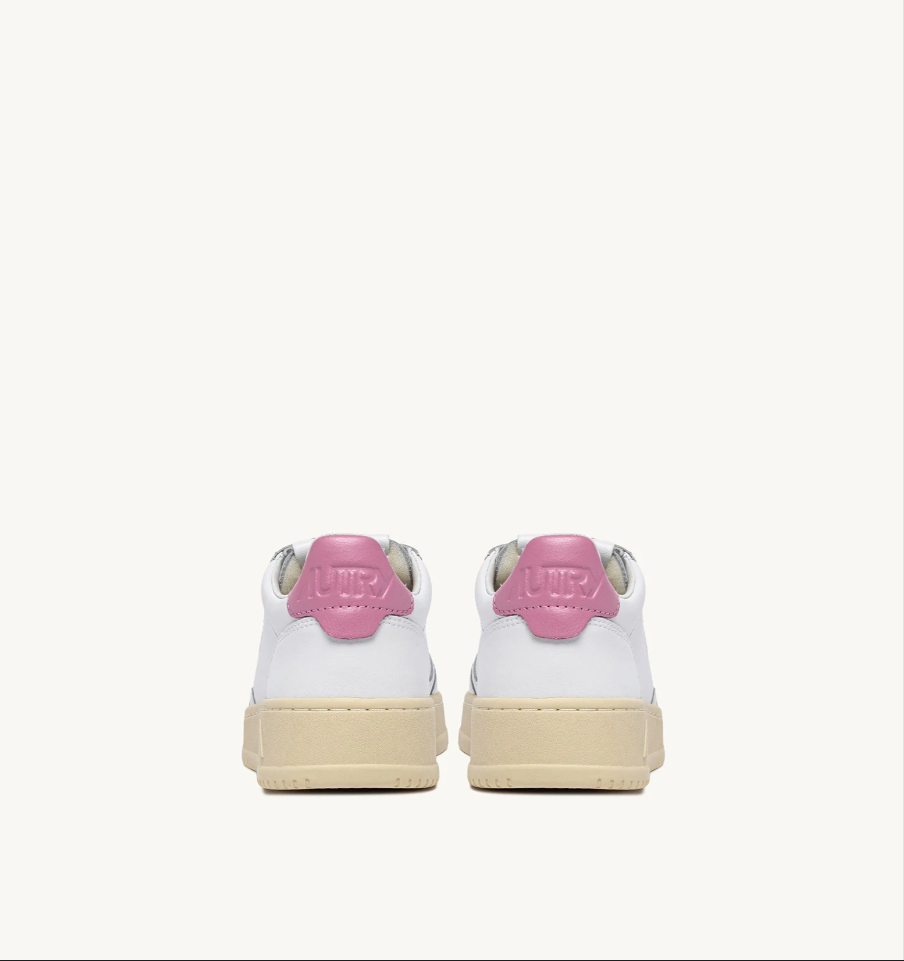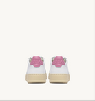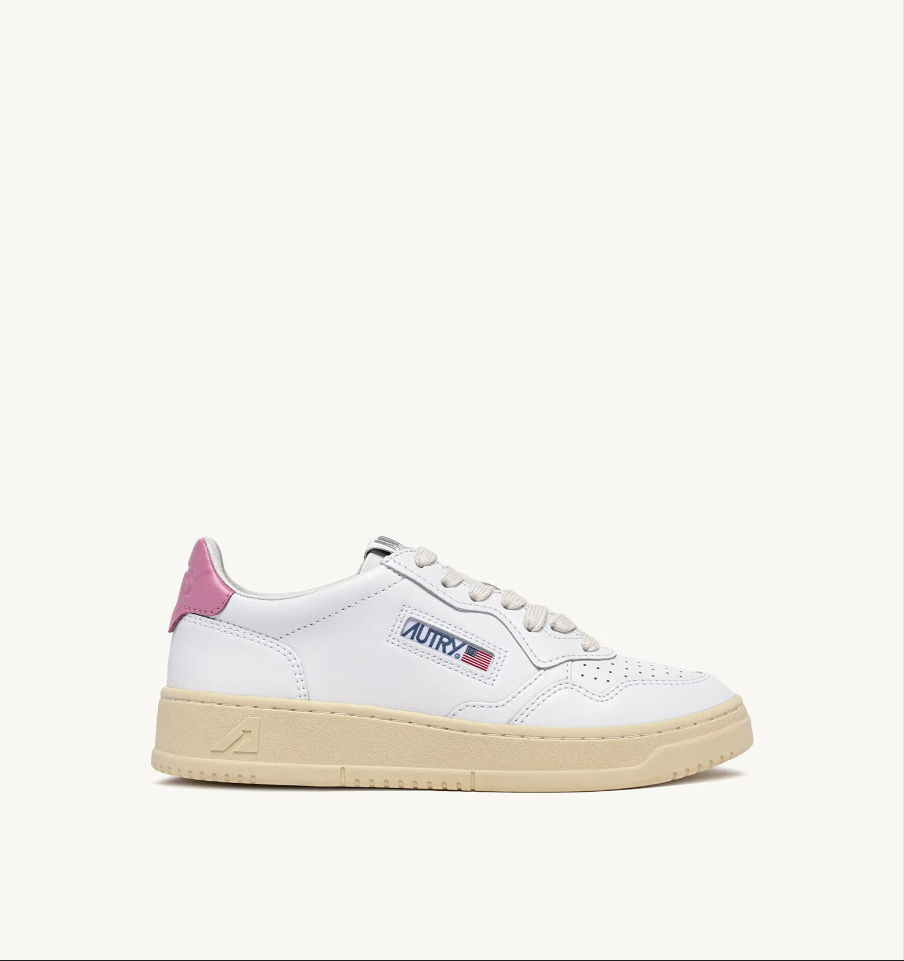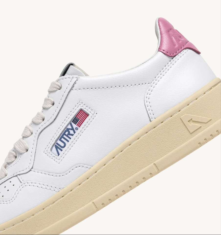 I dettagli sul lato esterno e sul tallone in pelle rosa sono personalizzati con il logo Autry.