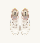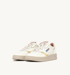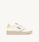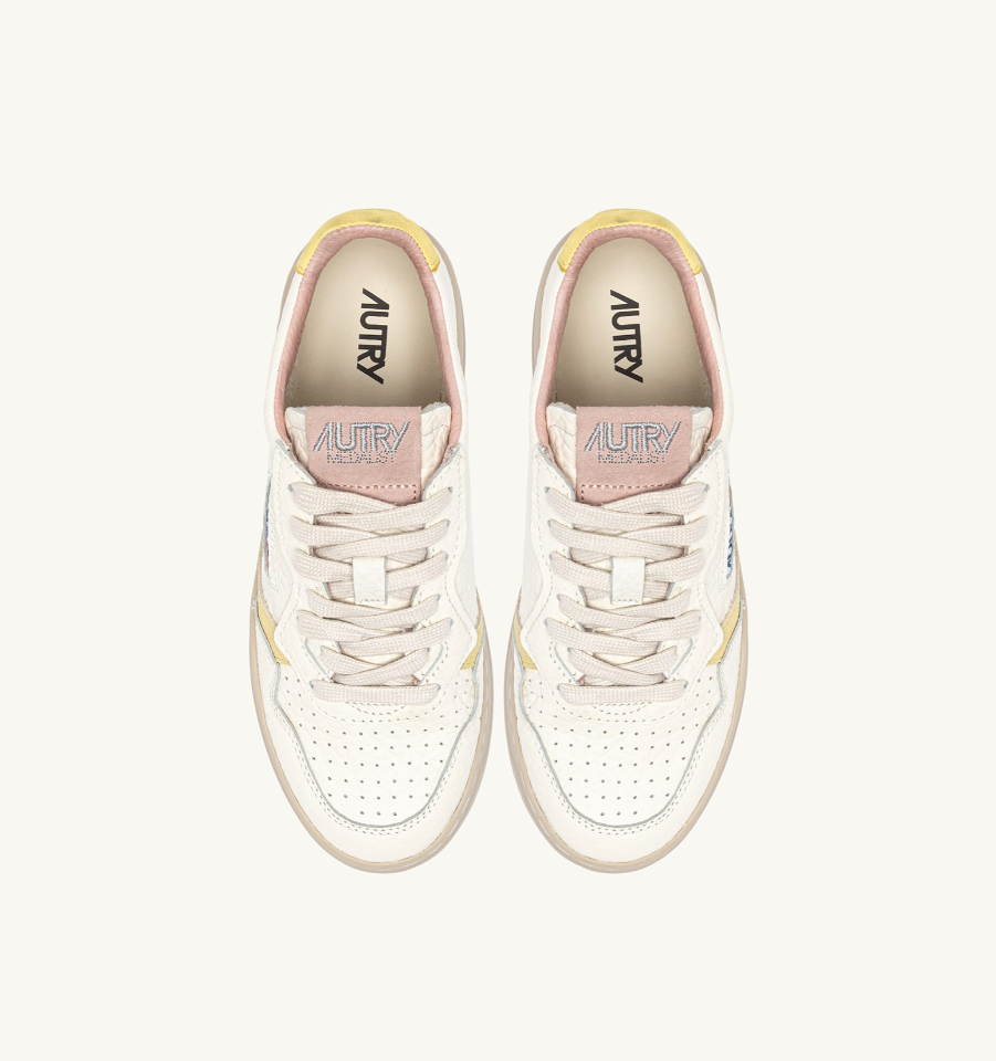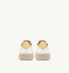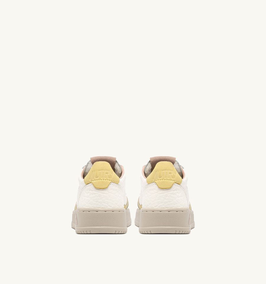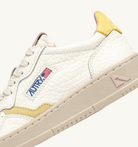 Il dettaglio logato in nabuk giallo sul tallone, l'inserto laterale con logo Autry jacquard e la suola leggermente più scura personalizzano il look.