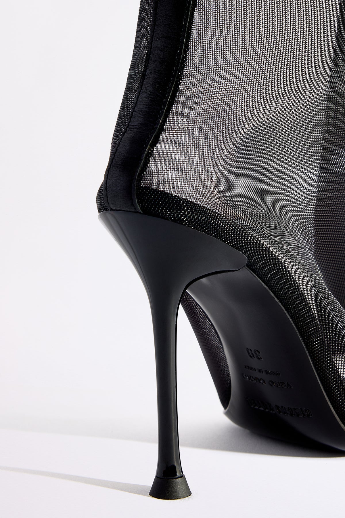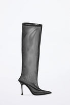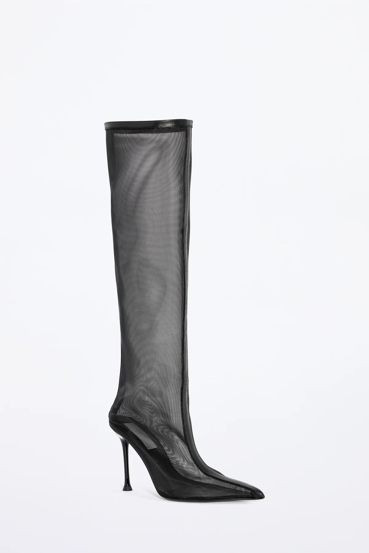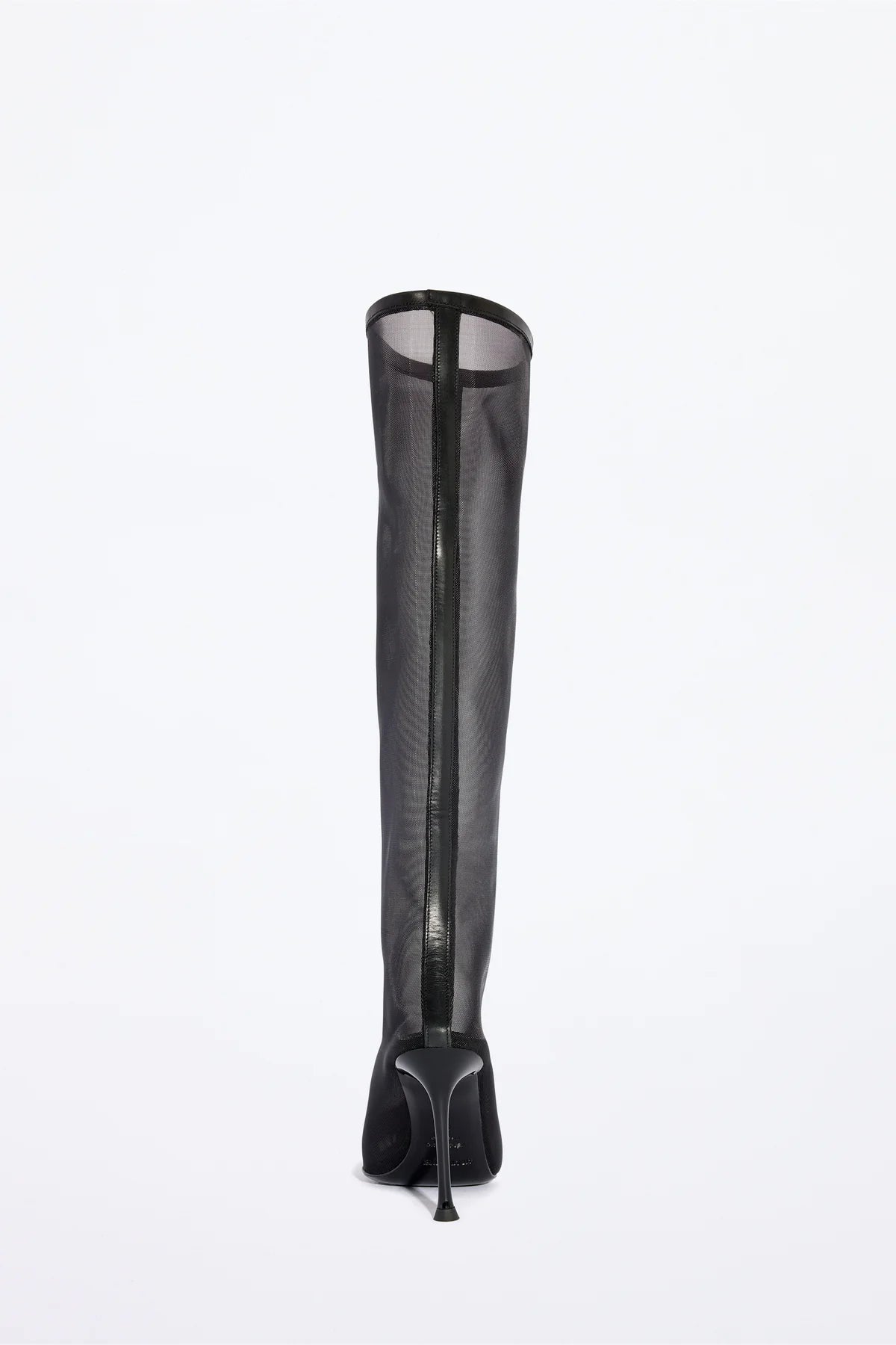 STIVALE ALTO TRASPARENTE IN SIMIL ORGANZA RIGIDA, ALTEZZA SOTTO AL GINOCCHIO,  A PUNTA CON TACCO A STILETTO DA 9 CM.