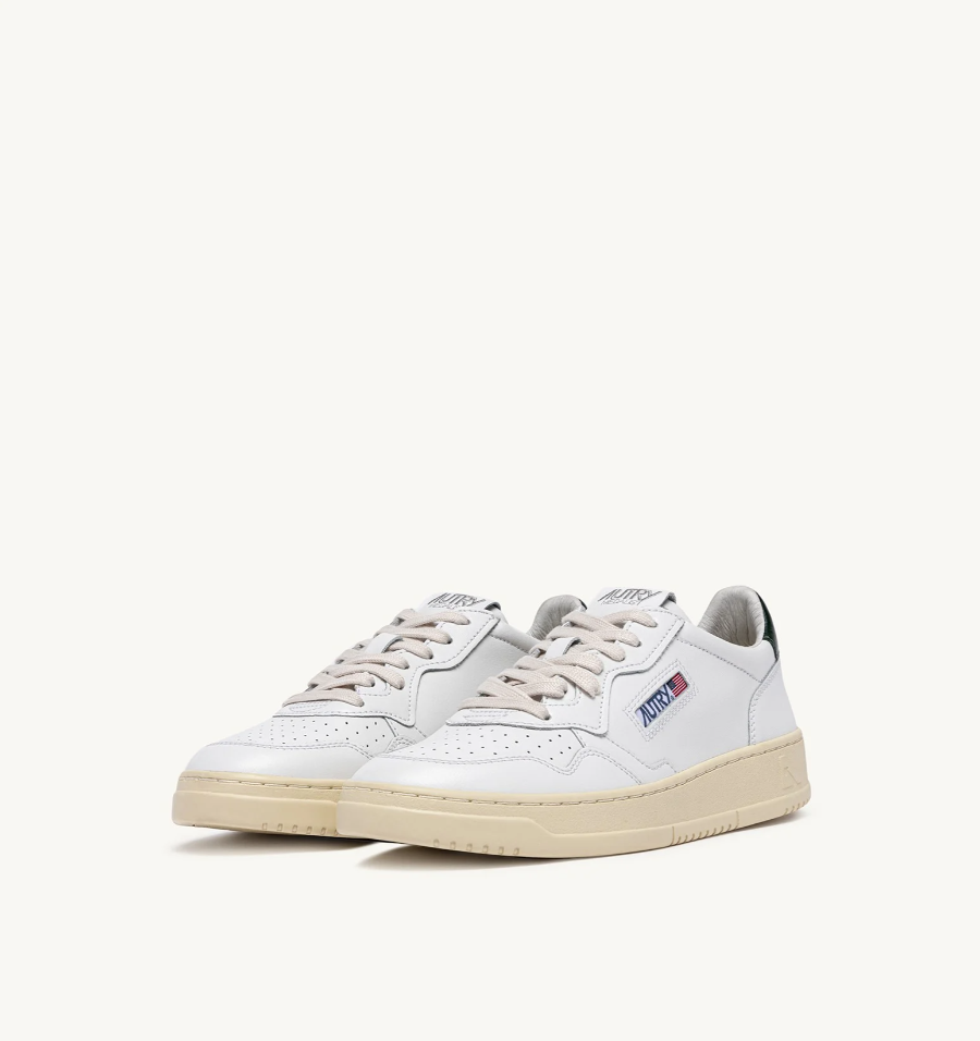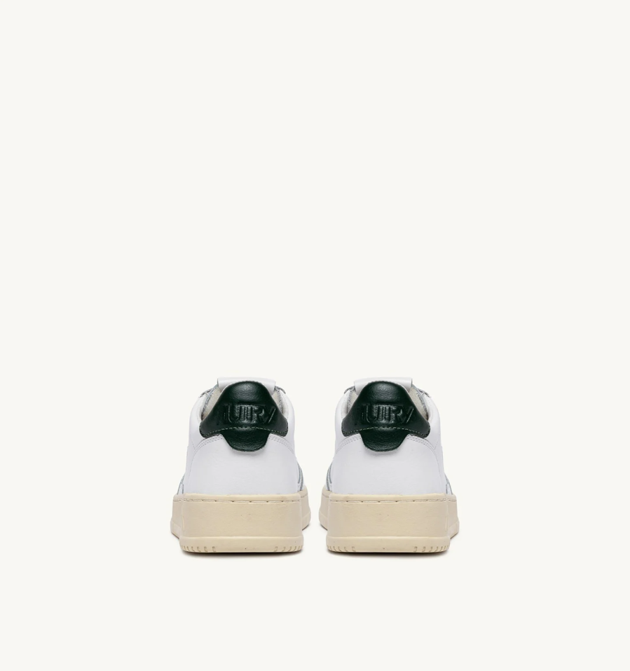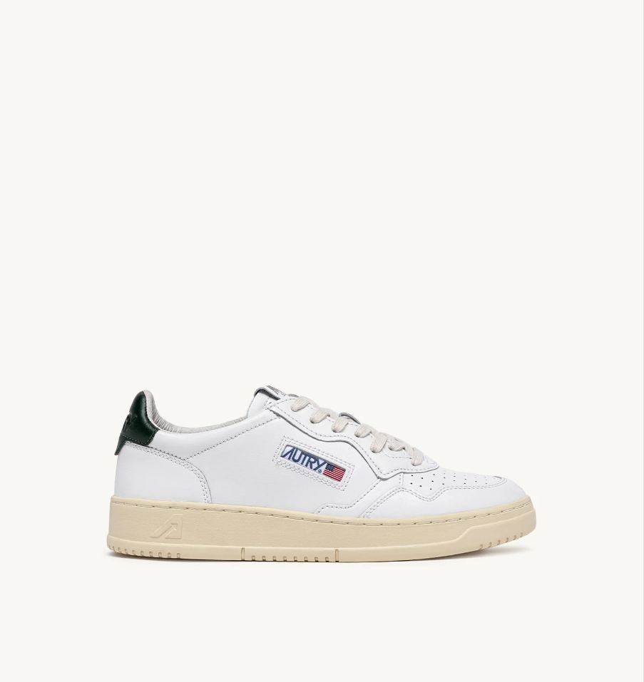 I dettagli sul lato esterno e sul tallone in pelle verde sono personalizzati con il logo Autry.