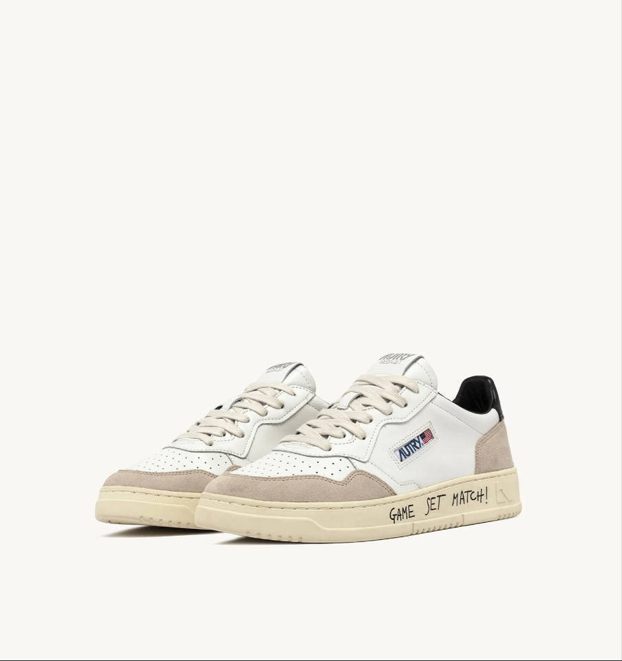 Questa scarpa da ginnastica da uomo è realizzata con tomaia in pelle di colore bianco, traforata sulla punta, ed è rifinita con inserti in morbido suede sui lati e talloncino posteriore nero. Focus sulla suola in gomma, personalizzata con il lettering “Game Set Match!” in stile graffiti.