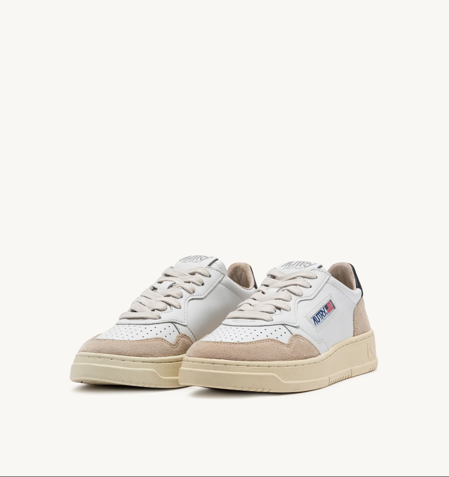 Questa scarpa da ginnastica da uomo è realizzata in morbida pelle bianca dall'aspetto autentico ed è rifinita con rinforzi in suede beige per un mix tattile e grafico deciso. Il dettaglio in pelle nera che decora il tallone è personalizzato con il logo Autry.