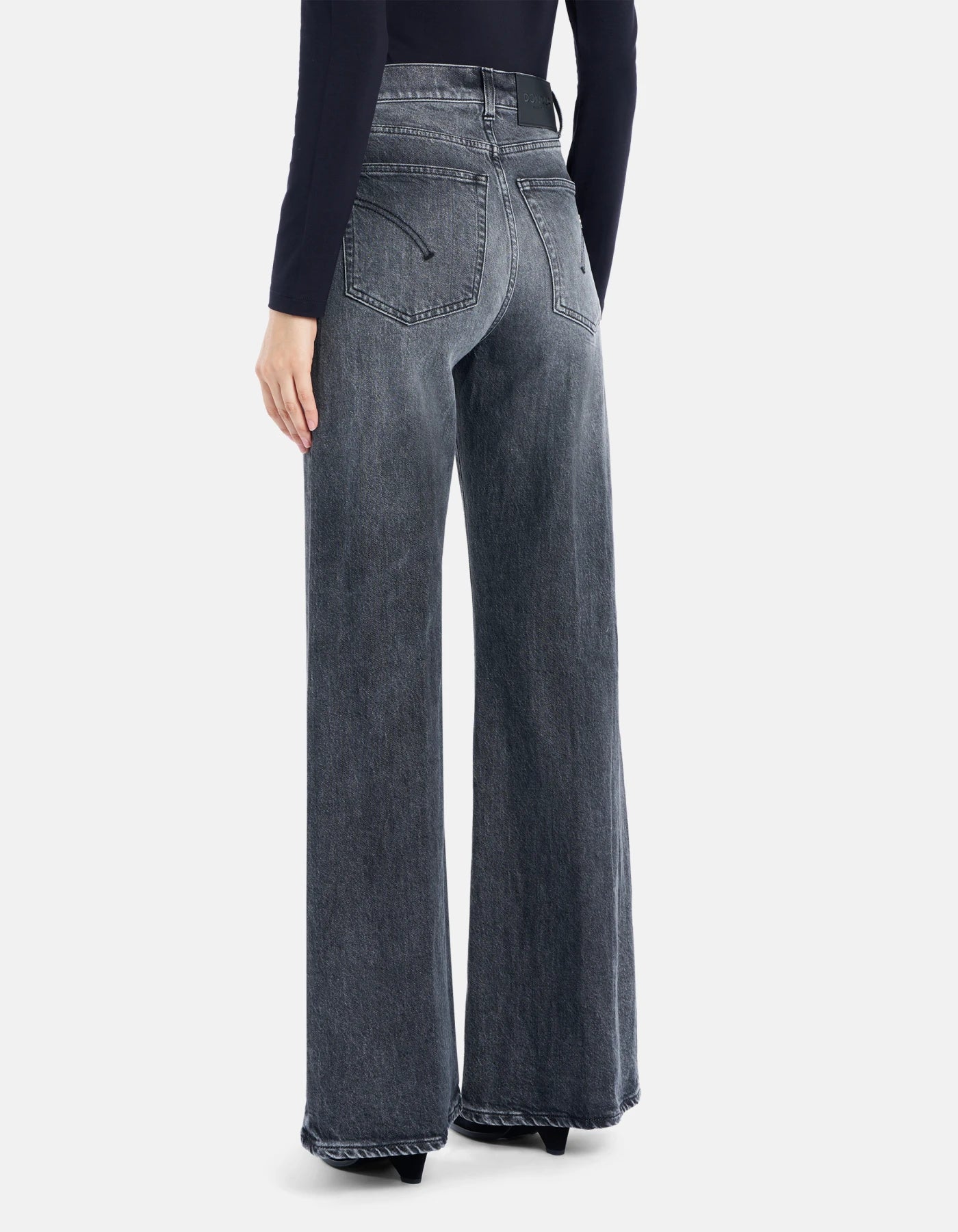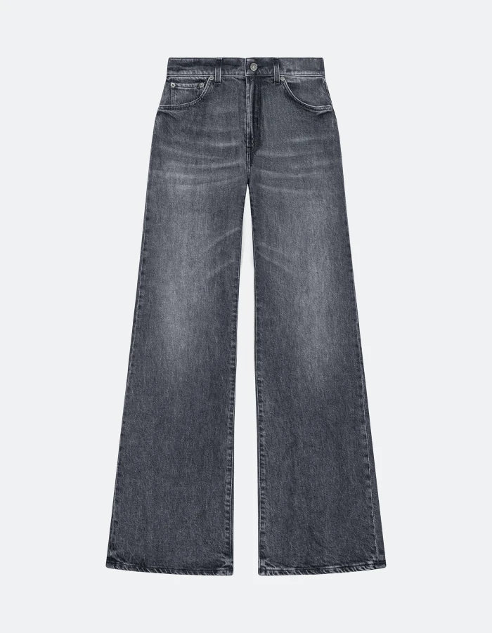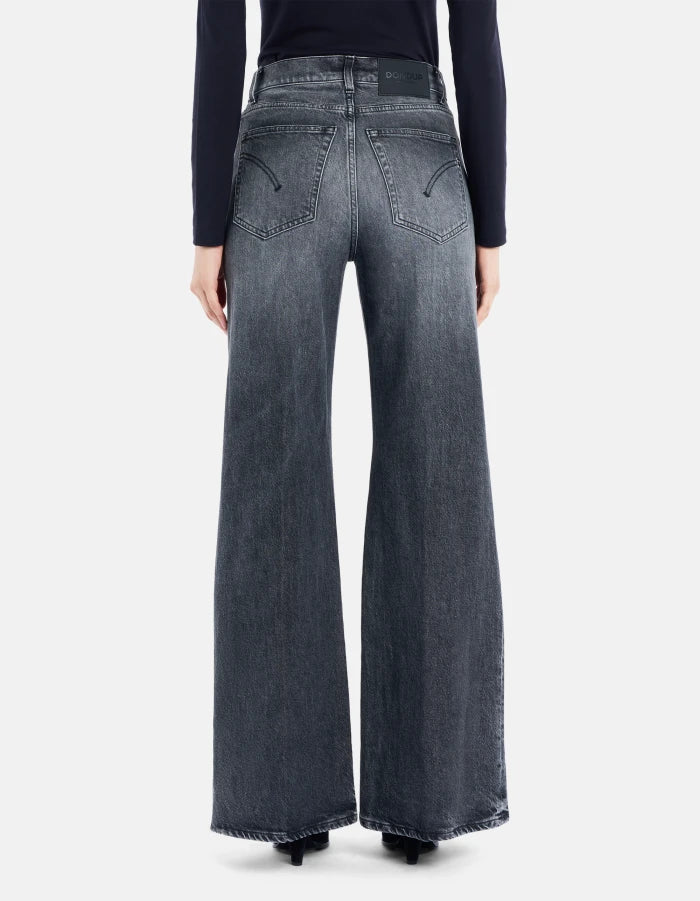 Jeans Amber cinque tasche wide leg fit, vita regolare, gamba ampia. Denim stretch comfort nero 14 oz. Lavaggio nero vintage pulito. Logo Dondup. Made in Italy