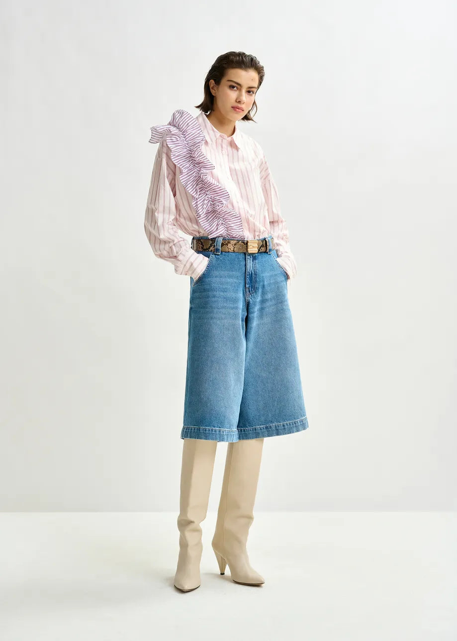 Una rivisitazione contemporanea della classica camicia a righe, realizzata in 100% cotone. Concepita per una vestibilità oversize, presenta una silhouette strutturata con colletto a punta e chiusura a bottoni sul davanti. Una balza a cascata di grande impatto, realizzata con strisce a contrasto, aggiunge un volume dinamico. La rifinitura con orlo arrotondato la rende perfetta per essere portata sia rimboccata che libera, mentre le spalle leggermente scese le donano un aspetto casual. 100% cotone Materiale leggero, non elasticizzato Concepita per una vestibilità oversize Chiusura con bottoni Orlo arrotondato Spalle scese Dettagli a balze.