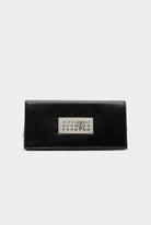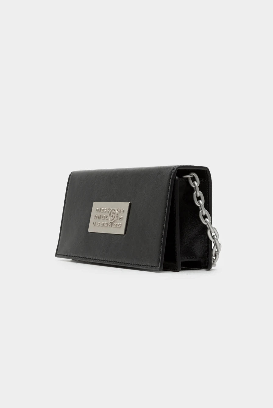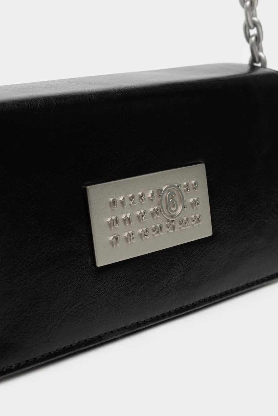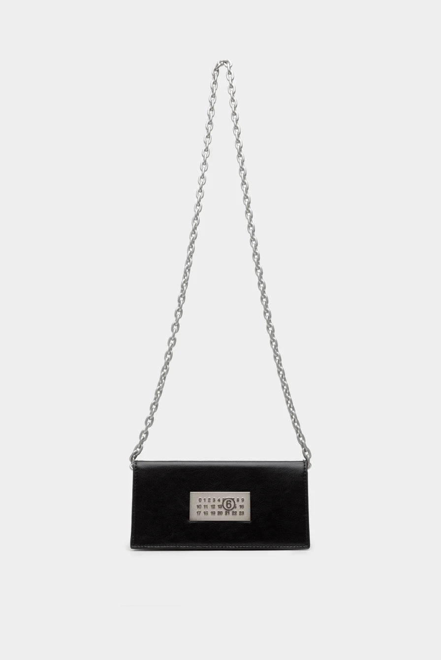 Realizzato in pelle lucida, il numeric chain wallet è un modello a doppio uso che può essere indossato con la tracolla regolabile o portato a mano come una pochette. Il modello è rifinito con una chiusura magnetica. Sul retro si trova la firma discreta ma inconfondibile di MM6, una linea orizzontale di impunture bianche.