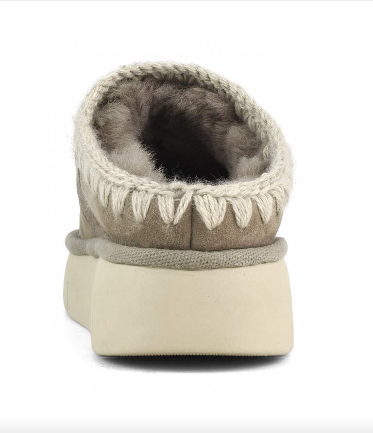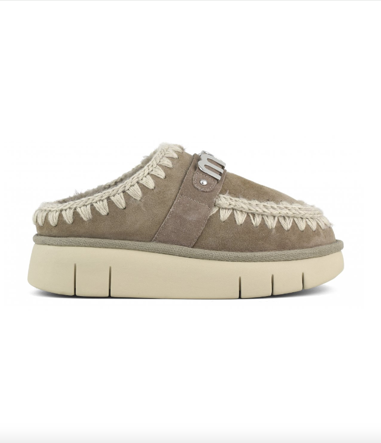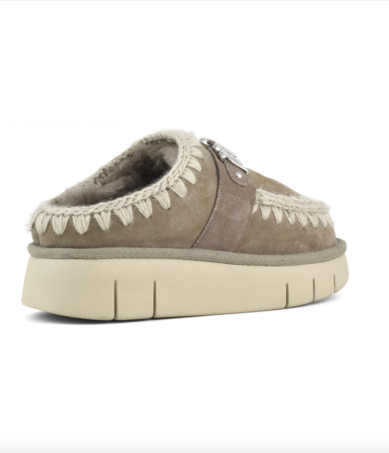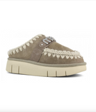 Il bounce clog di mou con logo in metallo è realizzato artigianalmente in vera pelle di montone double-face, con le inconfondibili cuciture in lana all'uncinetto firmate mou. Il plantare in morbido montone e la suola leggera in EVA & gomma rendono questo modello incredibilmente comodo da indossare.