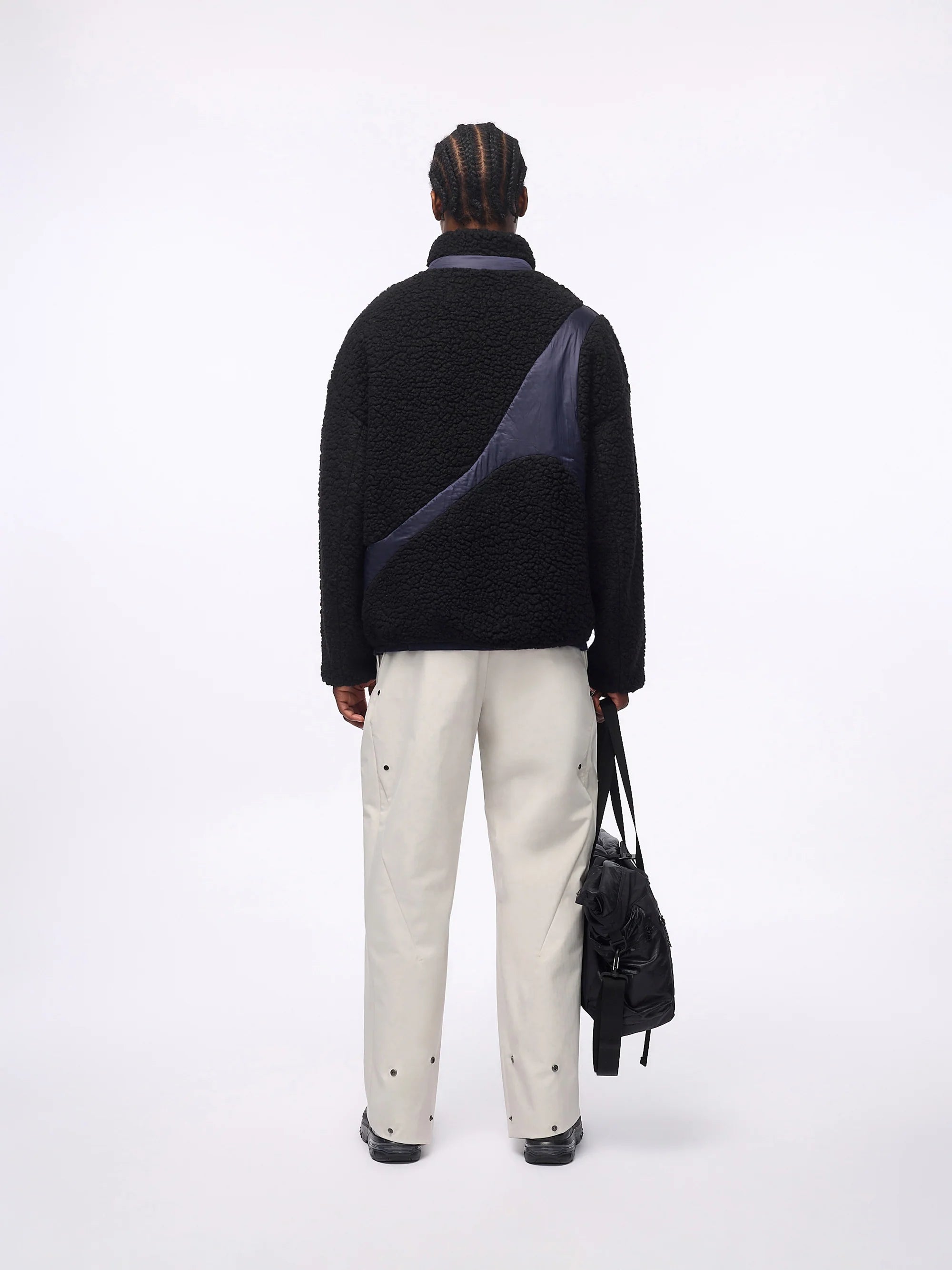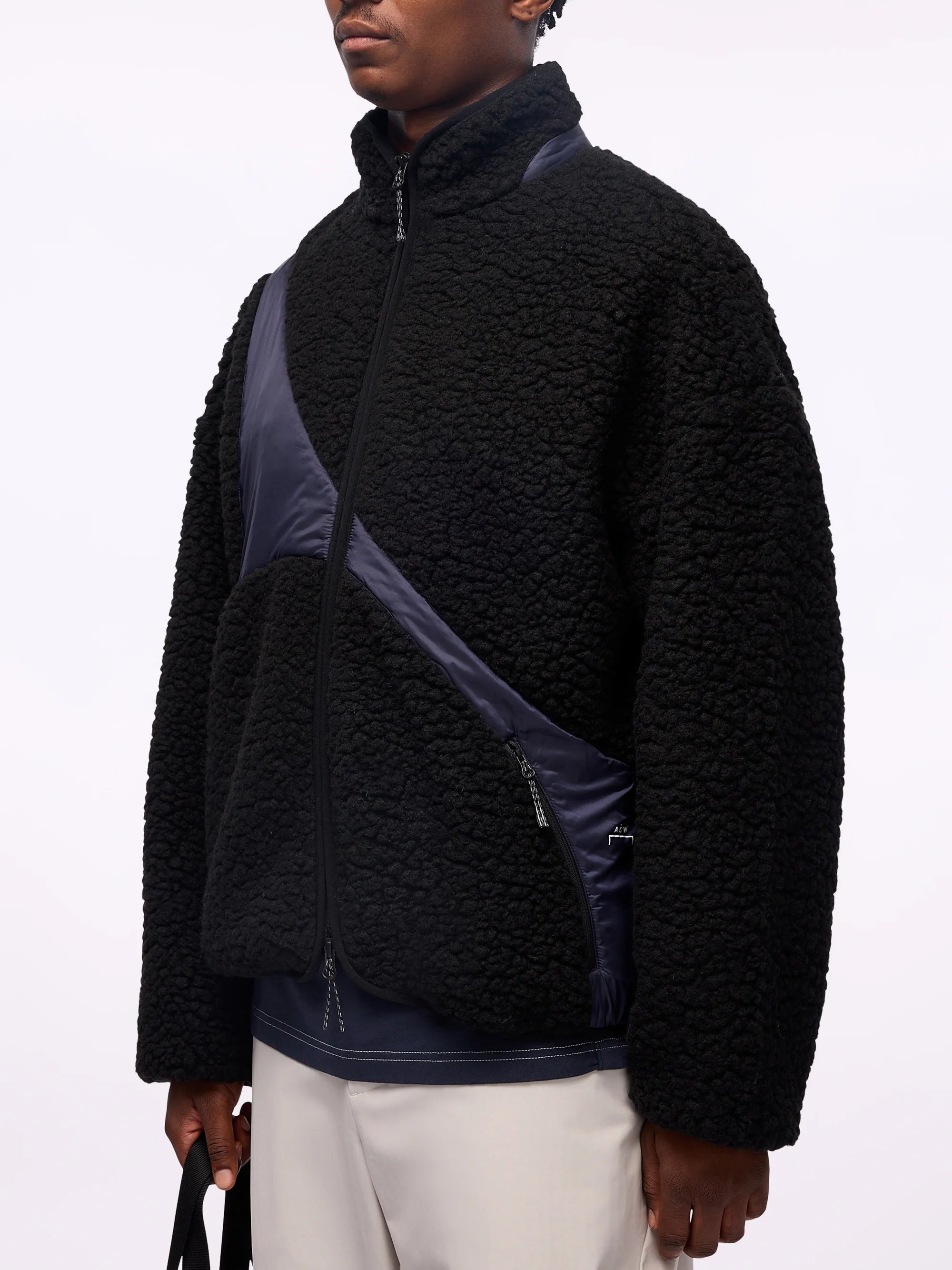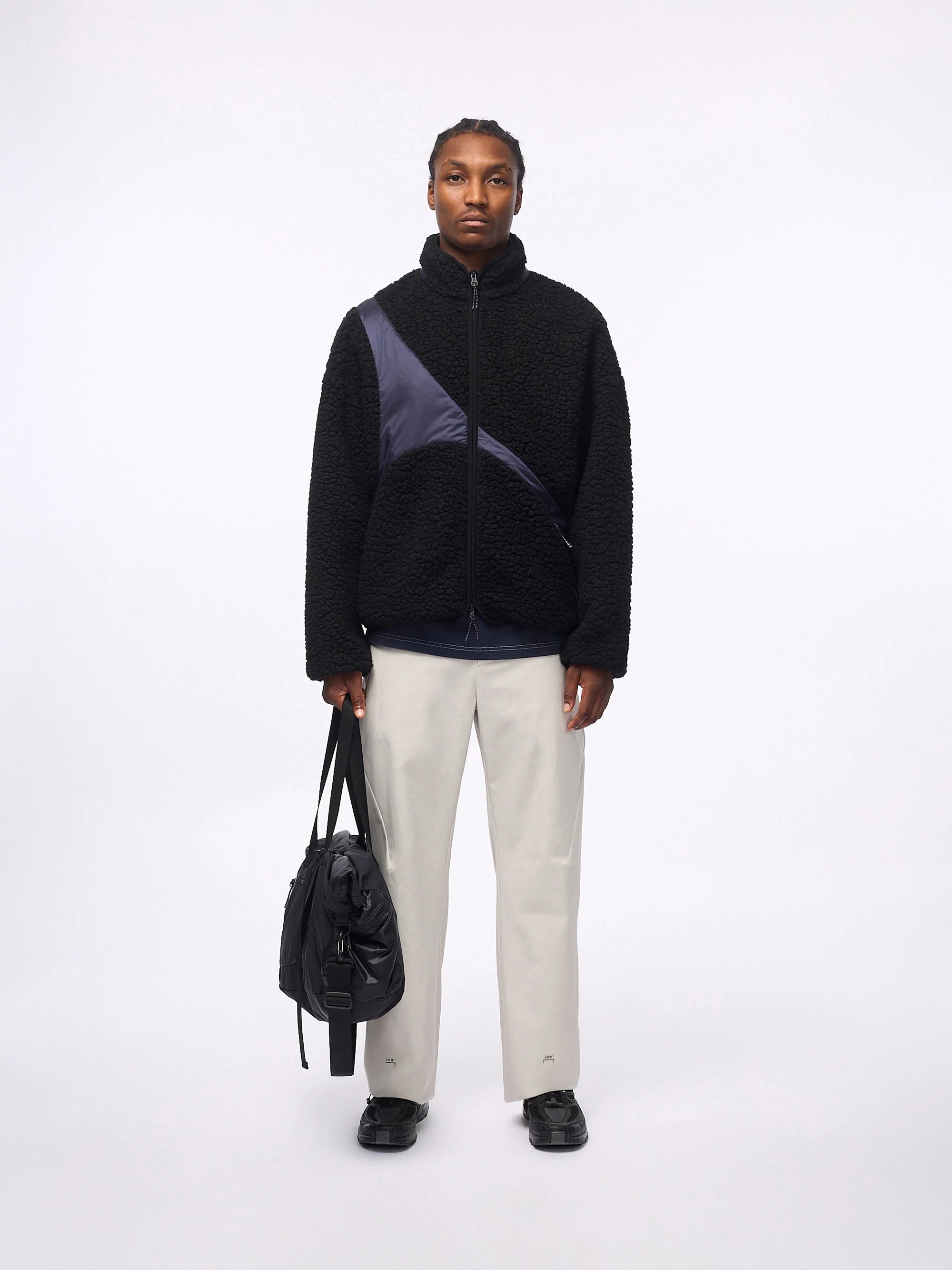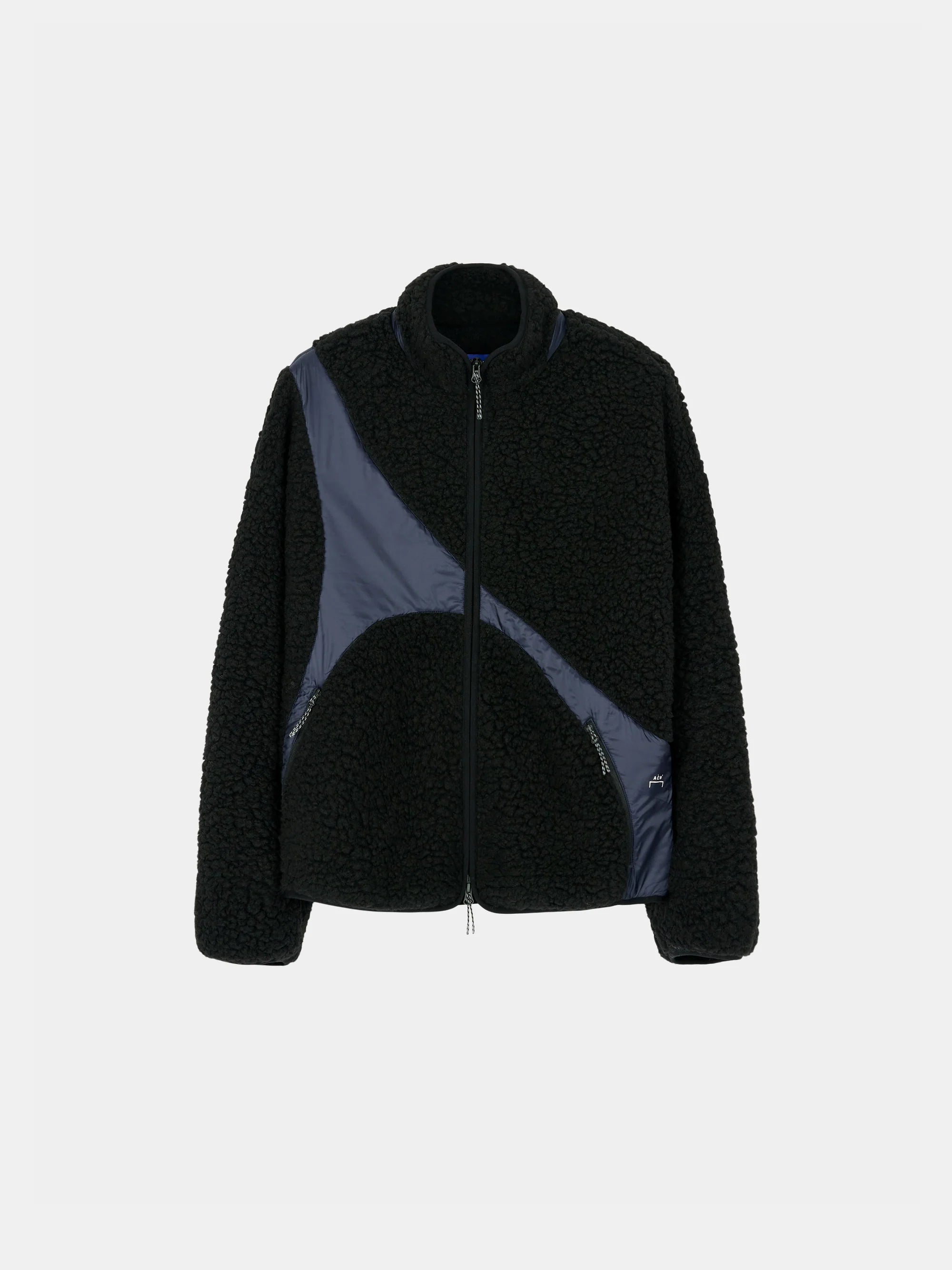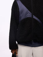 Pile dalla vestibilità comoda con cerniera, pannelli anteriori e posteriori curvi ricoperti da nylon trasparente leggero, rifinito con bordi elasticizzati su tutta la superficie.