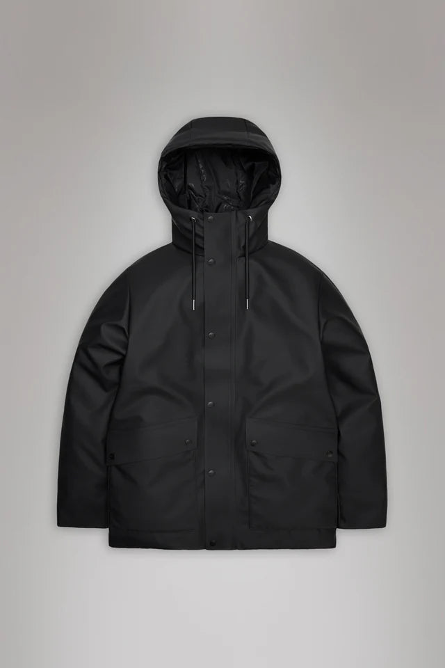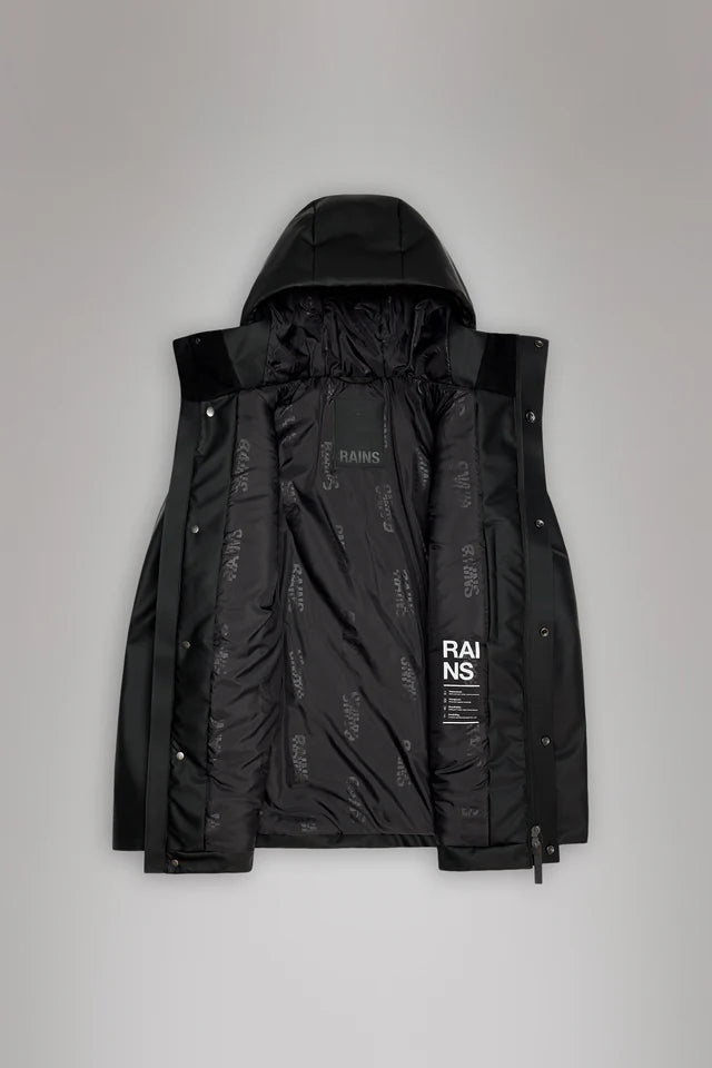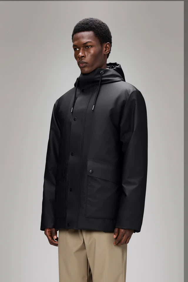 La giacca waterproof è realizzata con l'iconico tessuto PU di Rains, con una parte posteriore in tessuto forte e resistente. La mano è pulita, con un aspetto epurato e una sensazione liscia al tatto.