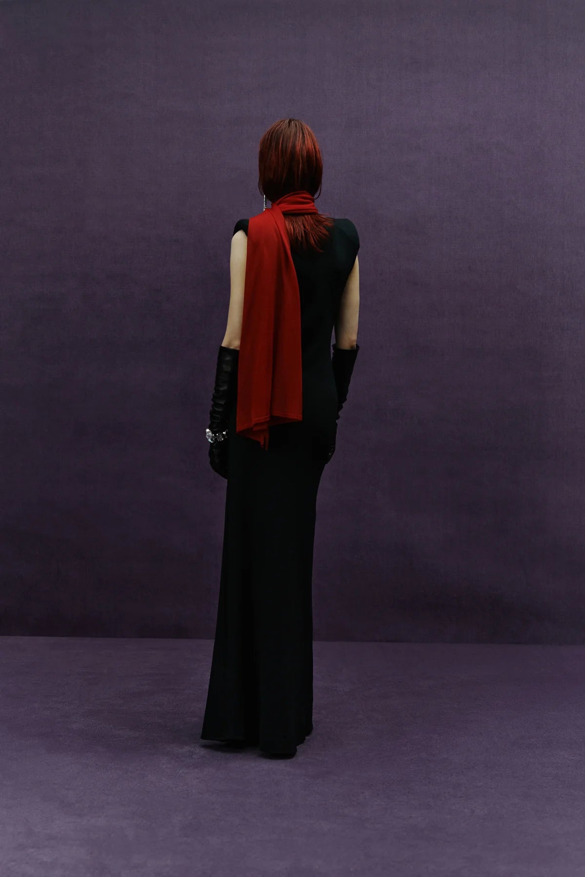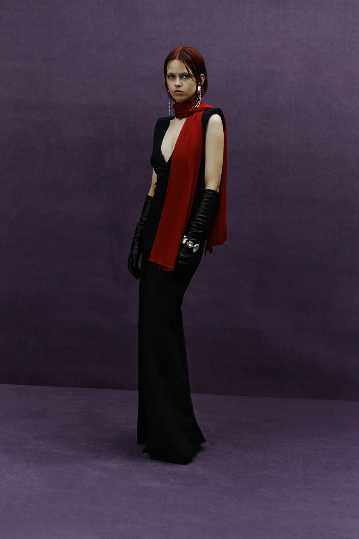 ABITO LUNGO IN VISCOSA, MODELLO A SIRENA CON SCOLLO A V PROFONDO E DETTAGLI ARRICCI SUL DAVANTI, MAXI SPALLINE, VESTIBILITÀ ULTRA SLIM.