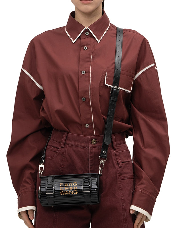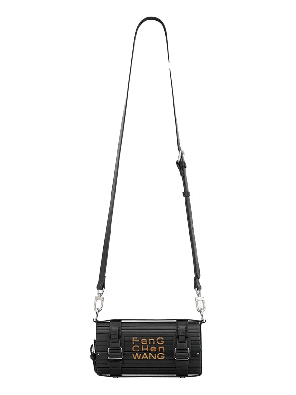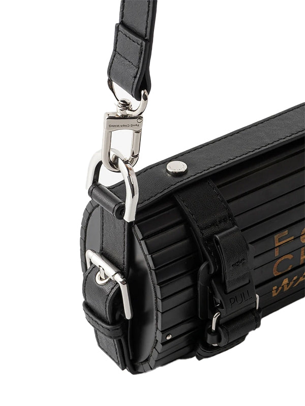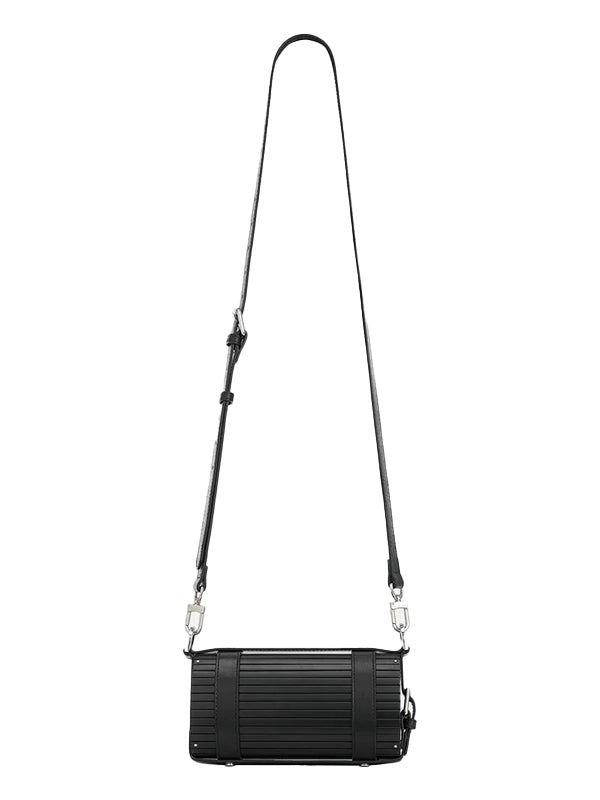 Bauletto cilindrico in bambù nero, con clip magnetiche per la chiusura e tracolla in pelle rimovibile.