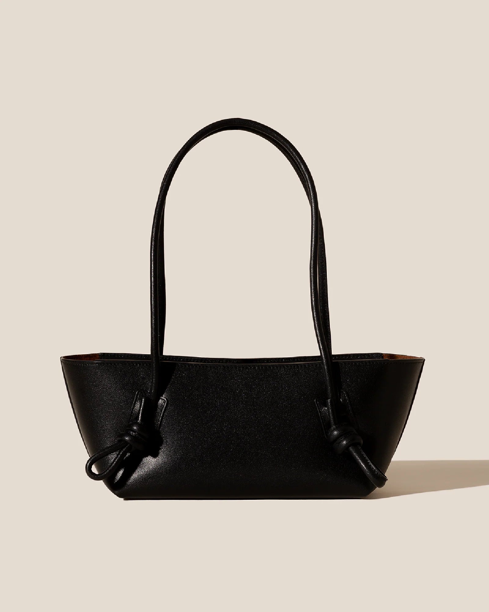 Borsa a tracolla con manico annodato, realizzata in pelle di vitello italiana lucida e foderata in pelle scamosciata di vitello.