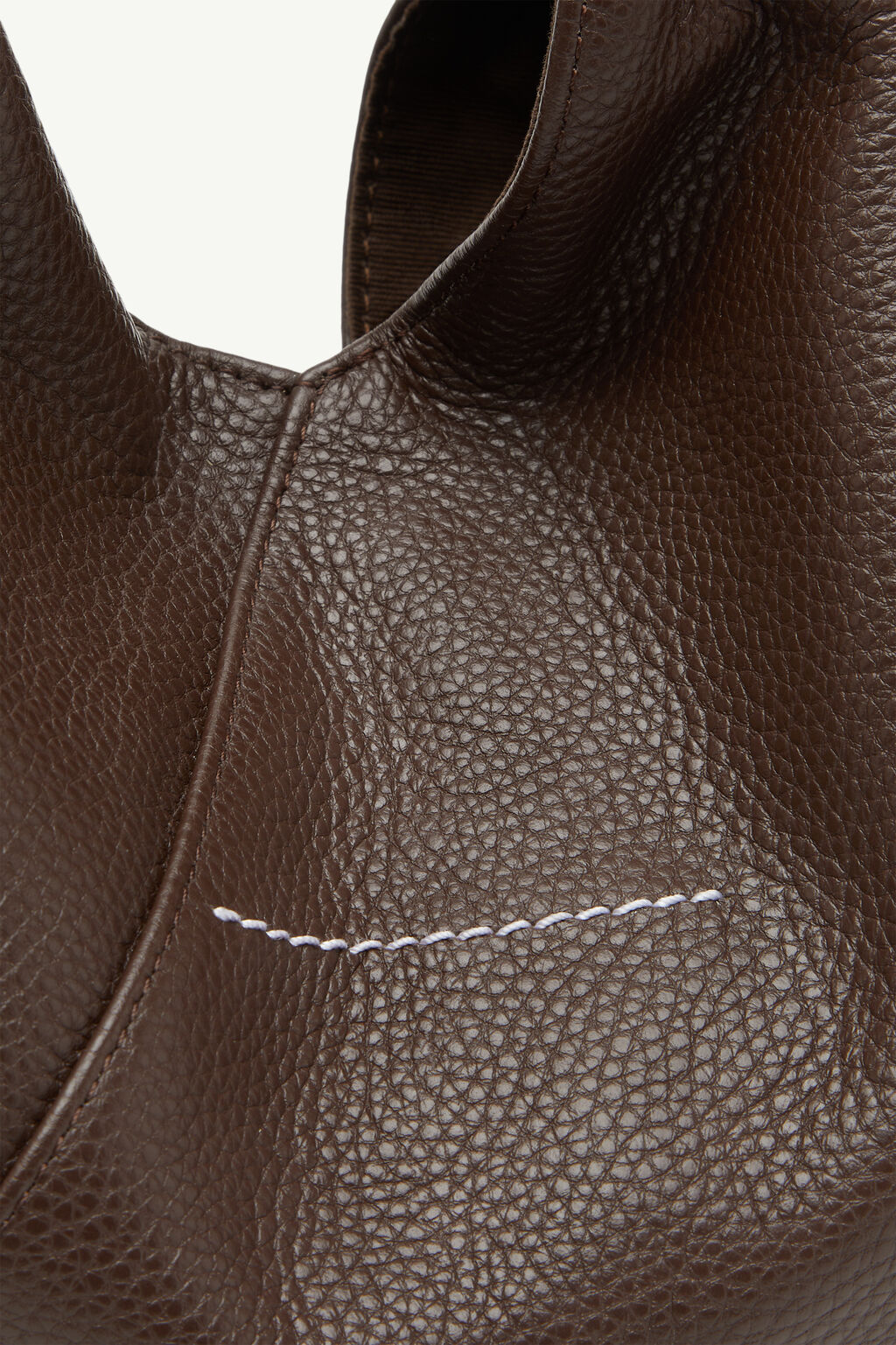 Corpo: 100% pelle di vitello Fodera: 100% cotone Borsa a mano in pelle martellata Unico manico avvolto liscio Cucitura centrale con dettaglio a contrasto White stitch line sul retro