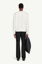 MM6 sovverte il concetto di familiarità con una grafica serigrafata, allegramente presentata come se fosse appuntata sulla scollatura. Gli orli a vivo e le cuciture a overlock sono il risultato di un'estetica che si basa sul processo di lavorazione, mentre la struttura aperta aggiunge un tocco di classe alla classica felpa. Rifinita con la linea di impunture bianche, un dettaglio discreto che richiama MM6.