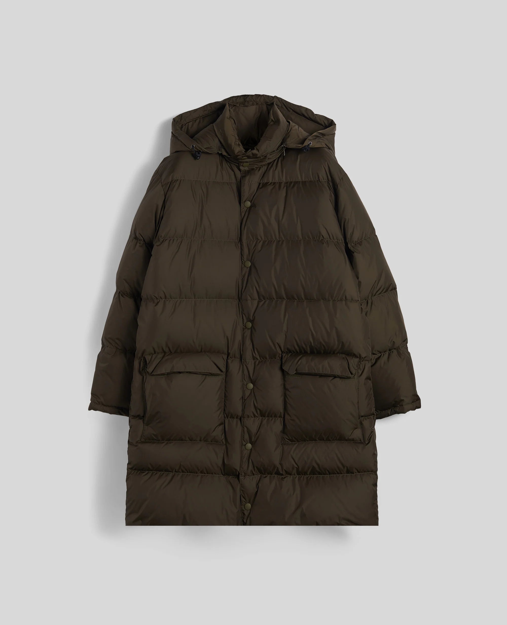 Cappotto con trapuntatura orizzontale e fodera in tono realizzato in nylon riciclato imbottito in piuma. Il modello si caratterizza per una chiusura frontale con zip e bottoni a pressione a vista, tasche applicate con patta e bottoni a pressione. Il capo, dotato di un pratico cappuccio rimovibile da richiudere nel collo, e rifinito dal tirazip personalizzato con logo Aspesi. Vestibilita regolare.