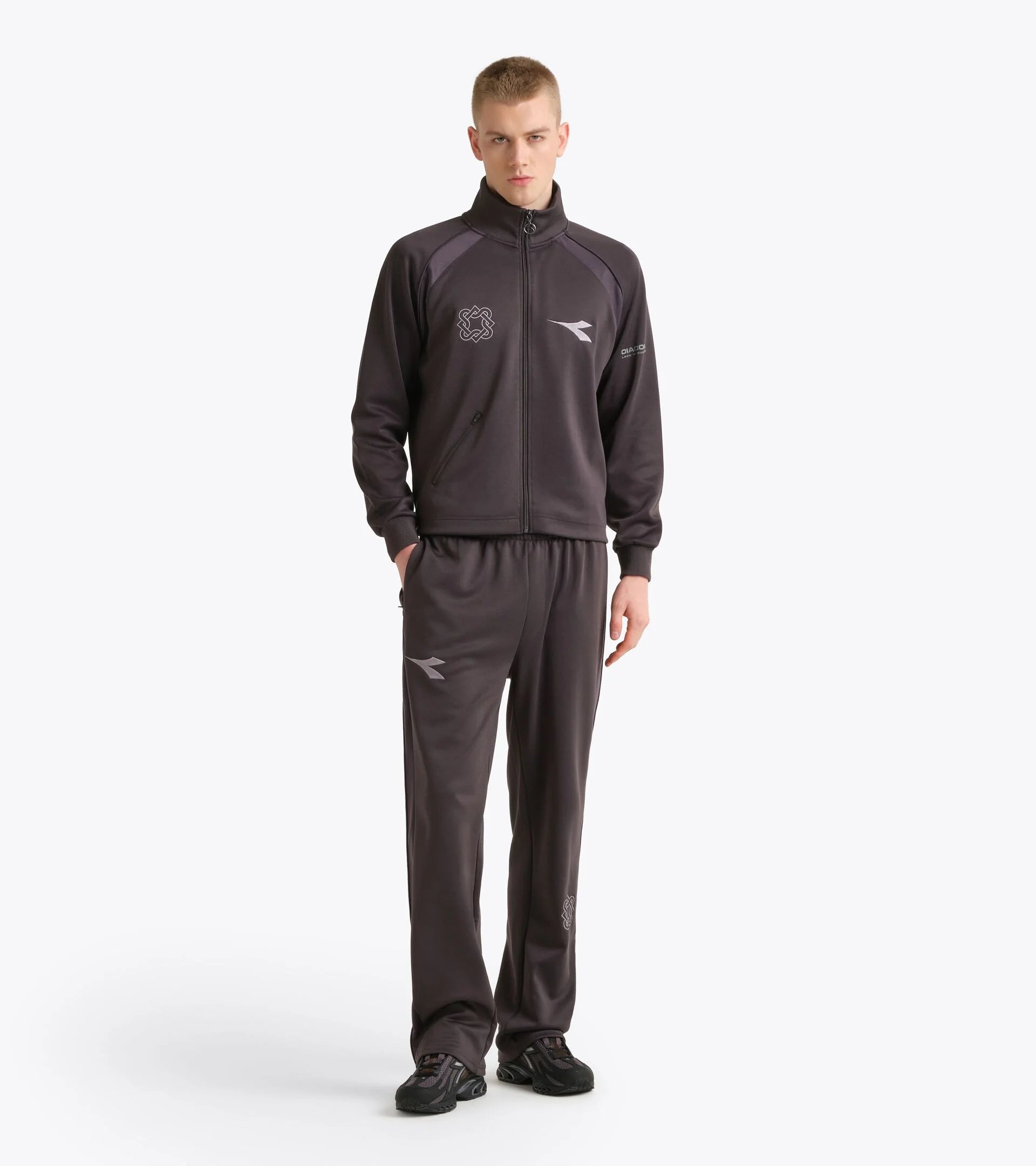 In onore dell'epoca d'oro del calcio italiano e con un pizzico di nostalgia, abbiamo collaborato con Lack of Guidance, brand di Amsterdam, per rivisitare il classico abbigliamento sportivo Diadora per i tifosi di oggi. Vero caposaldo della cultura calcistica, da sempre la tuta è un simbolo di identità, unità e stile. Questa felpa, che si ispira a modelli degli archivi Diadora, tra cui la collezione del fondatore di Lack of Guidance Akaar Amin, rivisita in chiave contemporanea una silhouette iconica in morbido misto poliestere e cotone, con classiche costine su fondo e collo e dettagli raffinati.