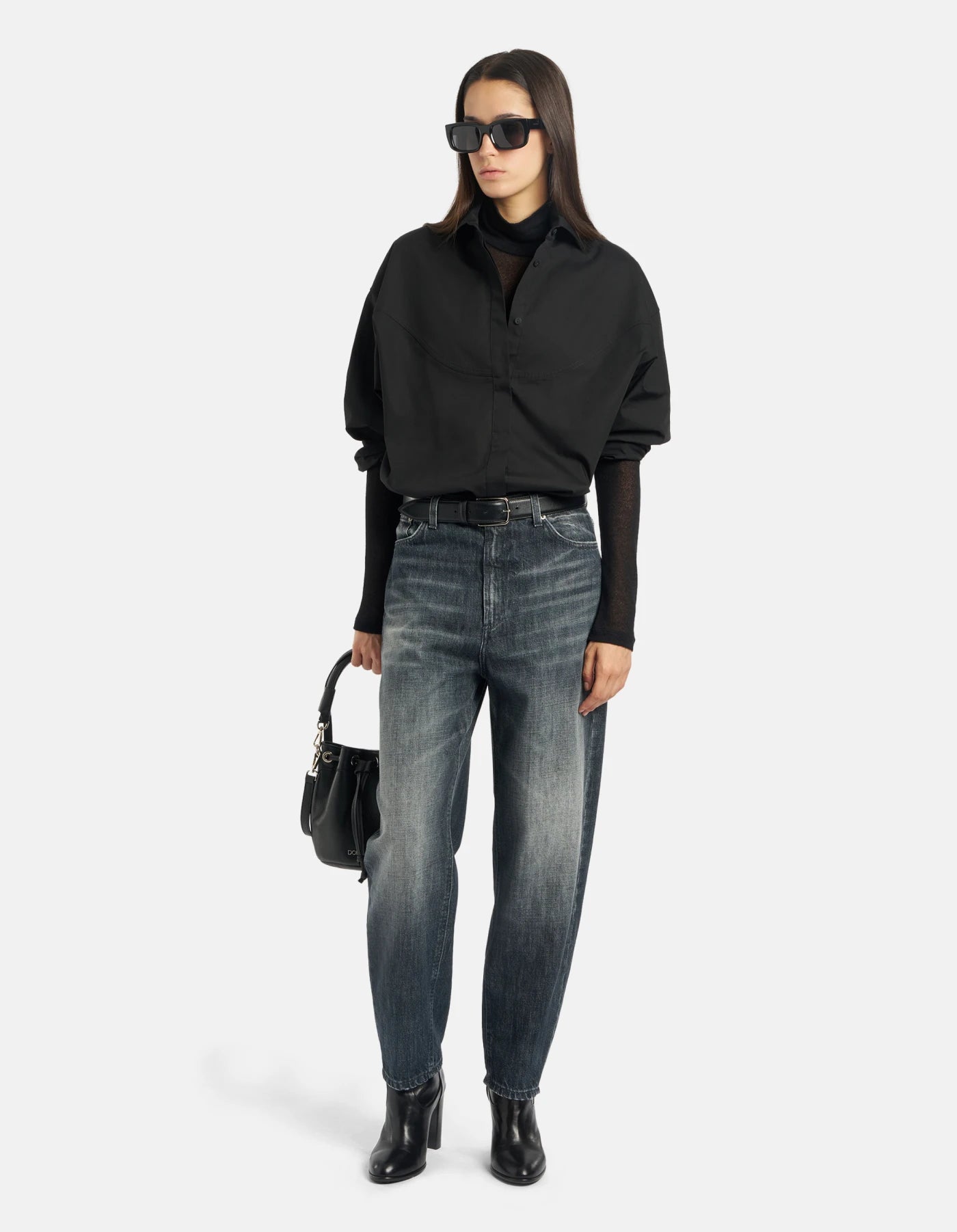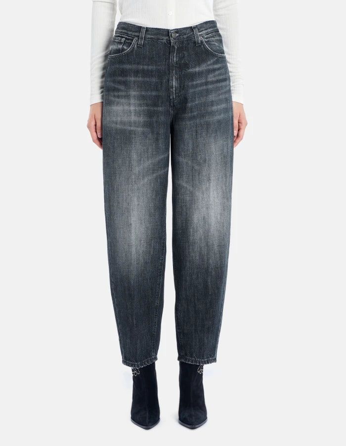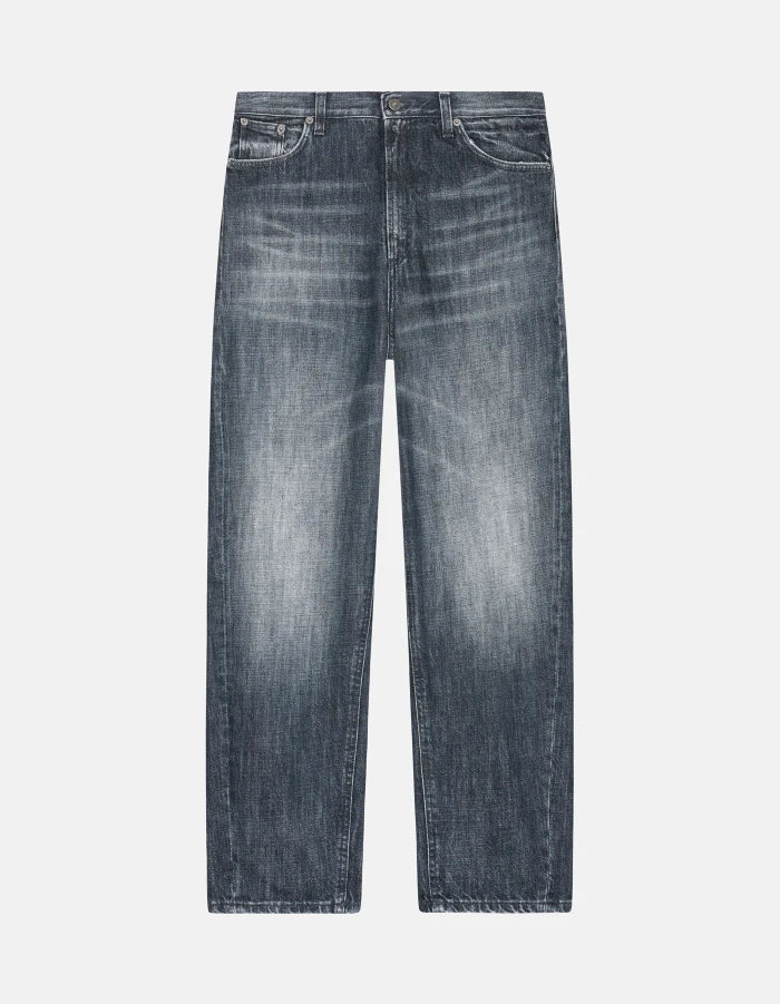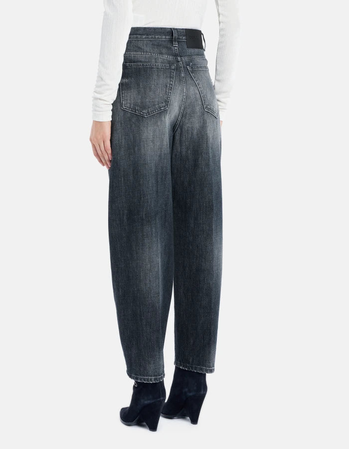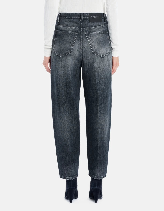 Jeans Bessie cinque tasche loose fit, vita alta. Denim fisso riciclato blu grigio 12 3/4 oz. Lavaggio scuro vintage pulito. Logo Dondup. Made in Italy