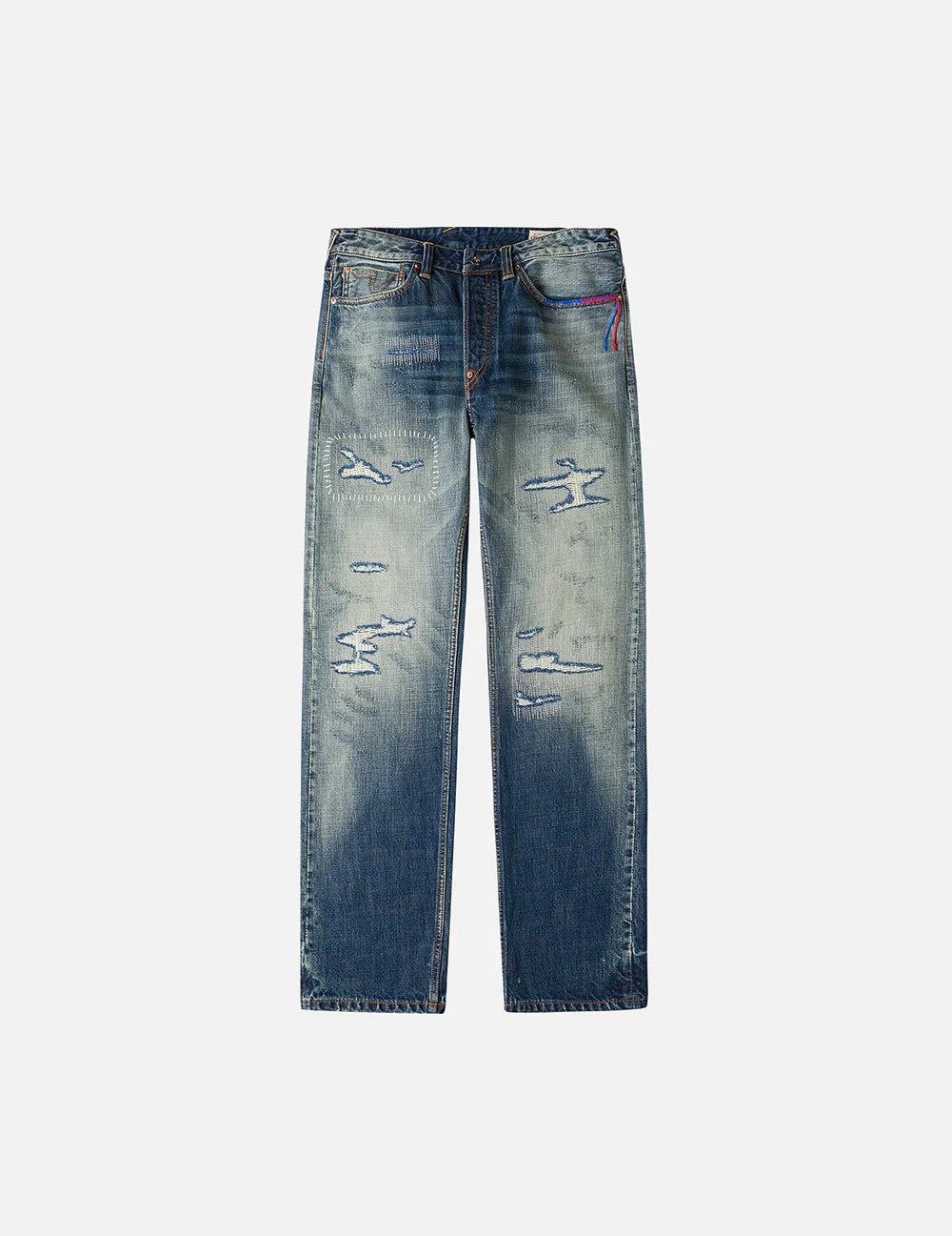 Questi pantaloni in denim all'avanguardia ridefiniscono lo street fashion con il loro linguaggio di design audace! Caratterizzati da un design a 7 tasche, i dettagli vintage meticolosamente realizzati emanano un tocco spensierato e ribelle. Il ricamo a gabbiano che adorna due tasche aggiunge un tocco artistico unico, elevando all'istante il look generale. Il processo di lavaggio offre una tonalità blu vintage naturalmente consumata, completata da una sfumatura di tonalità intense e chiare, incarnando un perfetto mix di stile casual e sofisticato. Le tasche sono impreziosite da suggestivi fili rossi e blu cuciti a mano, offrendo un potente impatto visivo e mettendo in mostra la meticolosa artigianalità di questo capolavoro di moda.
