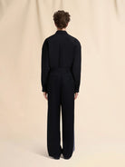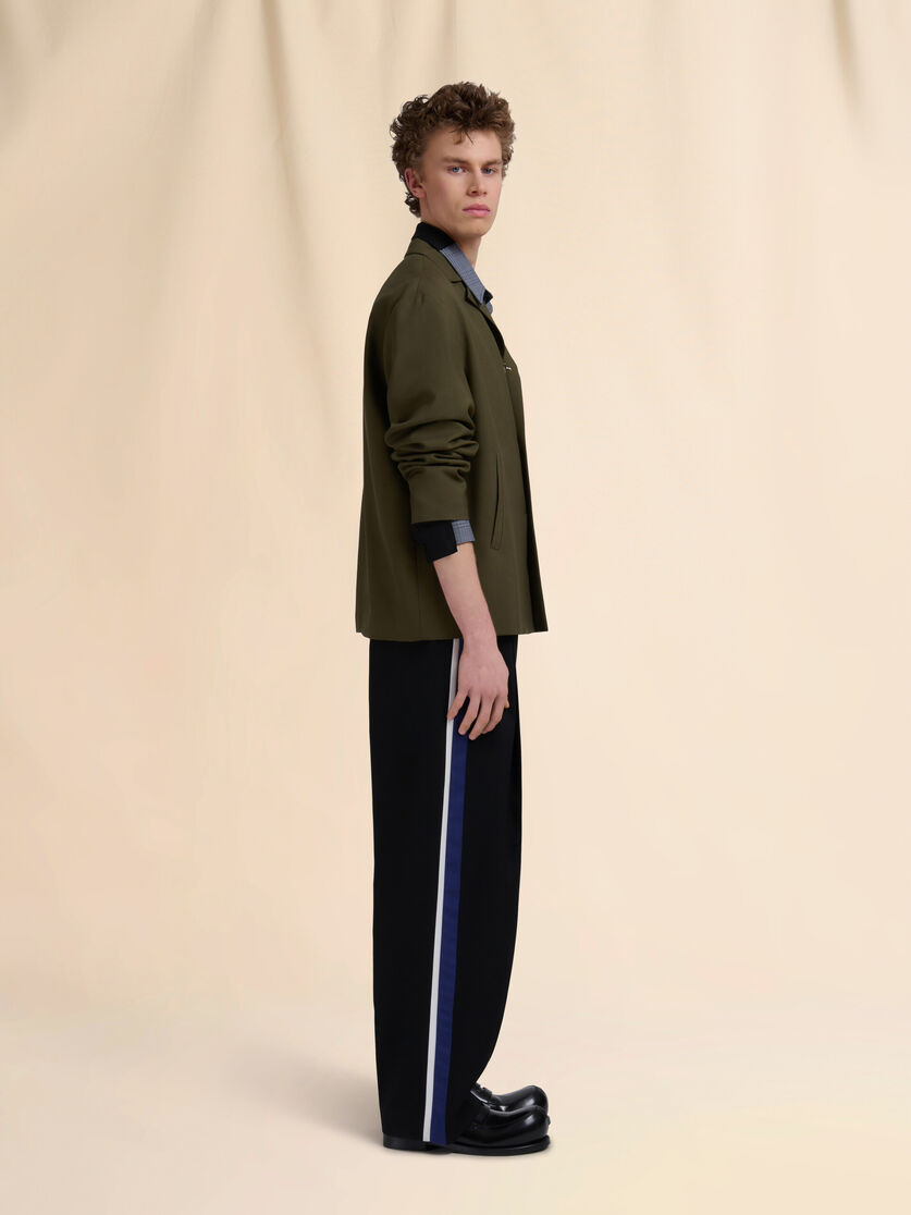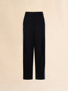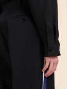 Pantaloni sartoriali in batavia di lana, caratterizzati da una texture compatta simile al crêpe e banda laterale color block con riga bianca e blu. Modello a gamba larga con vita media e voluminose pinces sul davanti. Taschini sul retro. Chiusura con zip coperta e gancio.