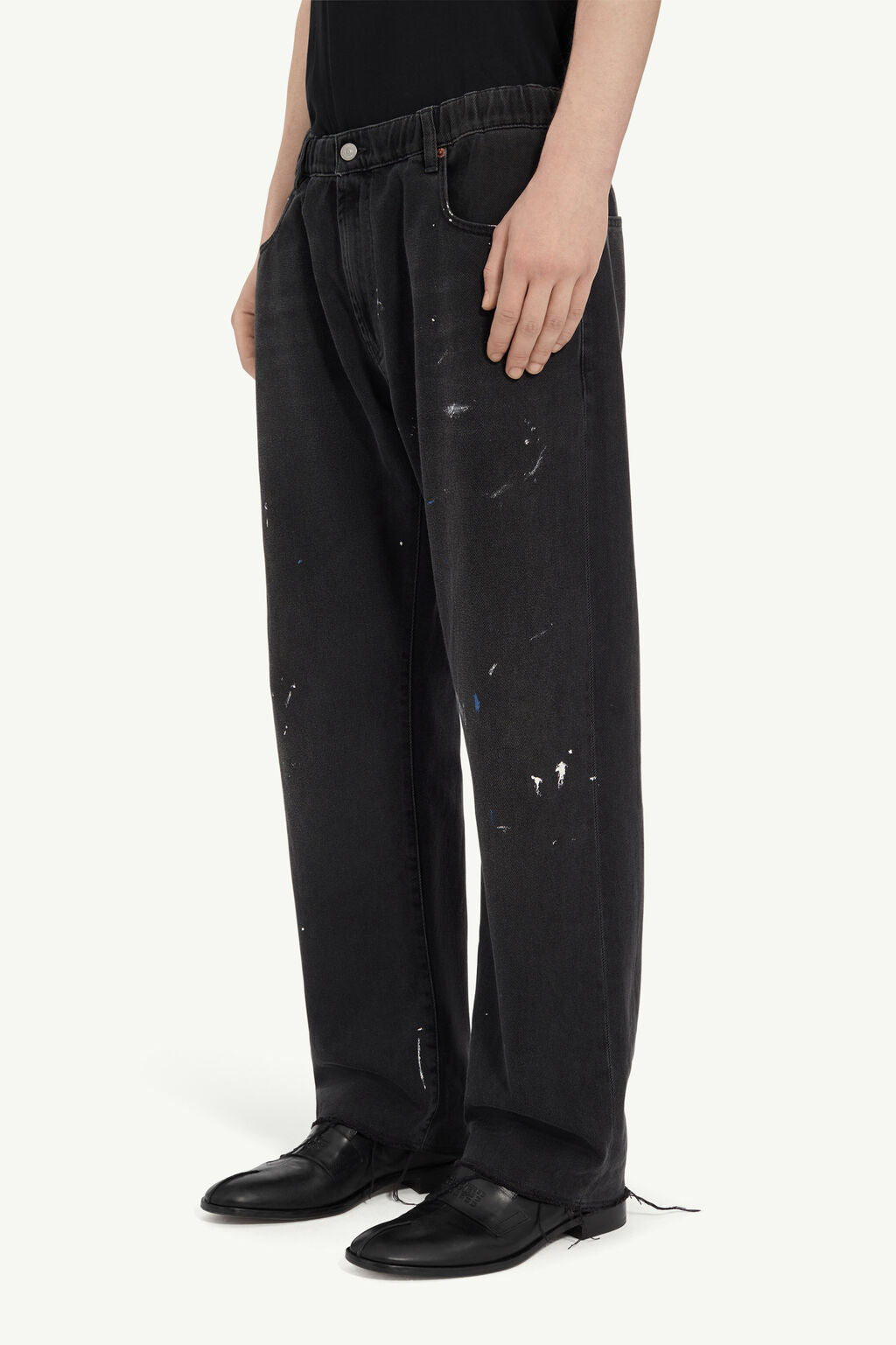 Questi jeans sono caratterizzati da una linea comoda a gamba dritta, con vita elasticizzata e orli a vivo che richiamano lo stile casual. La leggera scoloritura e le volute macchie di vernice evocano la spontaneità artistica, mentre la caratteristica linea di impunture bianche sul retro rappresenta un segno di appartenenza alla Maison.