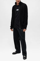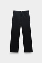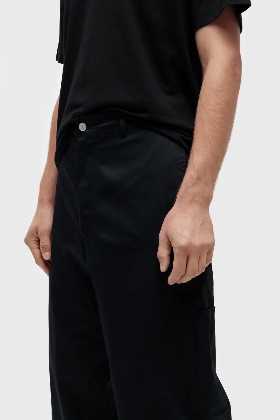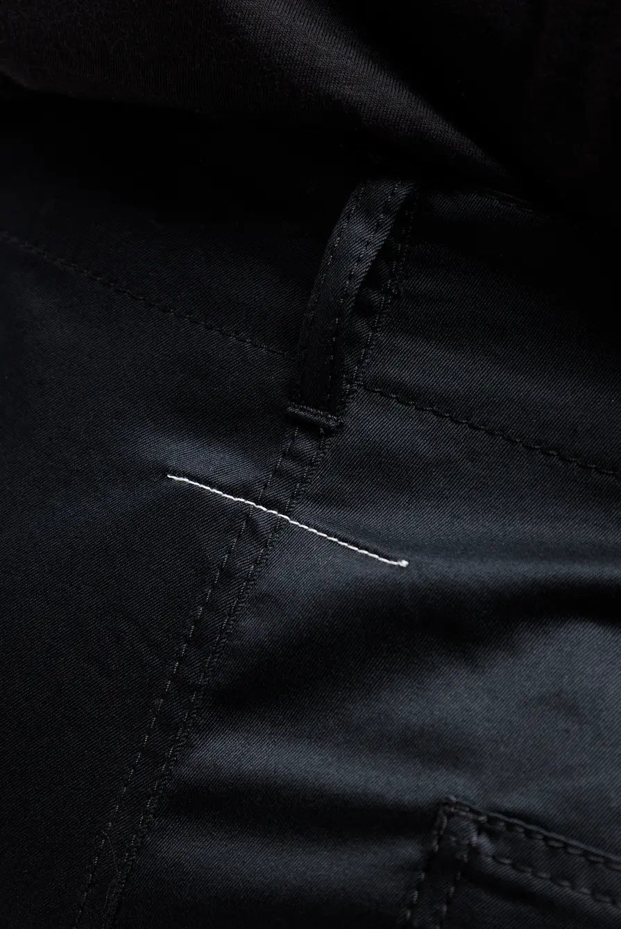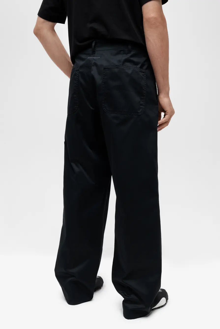 Pantaloni neri in raso di cotone liscio. Modello a gamba dritta con pannelli anteriori sovrapposti. Cintura con passanti, tasche scaldamani laterali, tasche posteriori applicate e cuciture MM6 a contrasto.