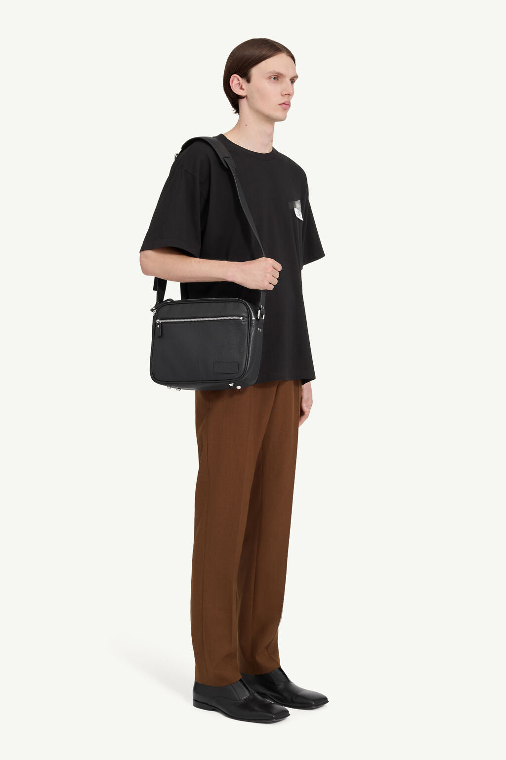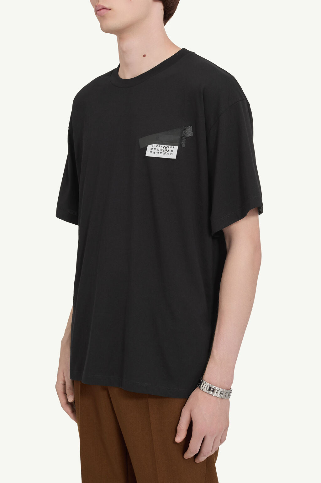 Questa t-shirt esibisce una stampa trompe l'oeil dell'etichetta numerica, fissata con un nastro da imballaggio fotorealistico. Ispirato a capi d'archivio trasformati a mano, il modello gioca con la percezione, l'irriverenza e l'illusione. Rifinita sul retro con la linea di impunture bianche, un dettaglio discreto che richiama MM6.