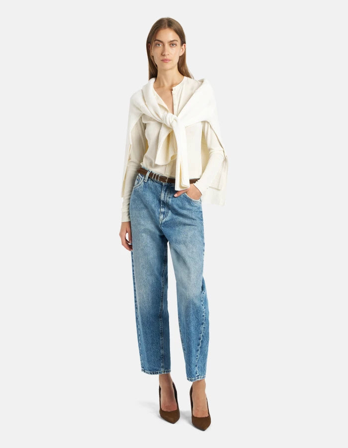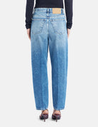 Jeans Bessie cinque tasche loose fit, vita alta. Denim fisso sale pepe blu 13 oz. Lavaggio chiaro vintage pulito. Logo Dondup. Made in Italy