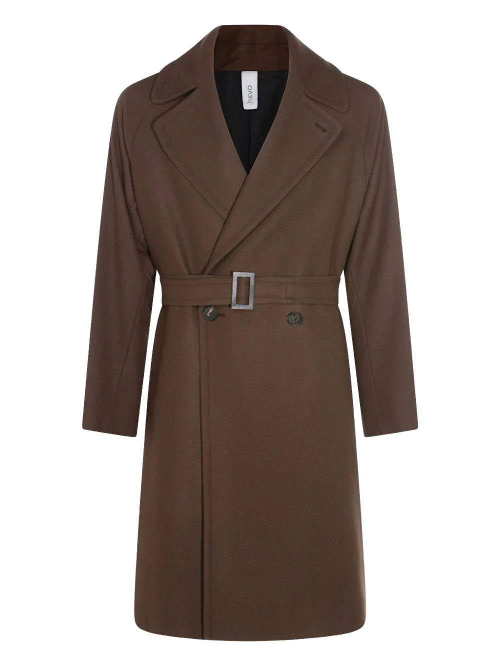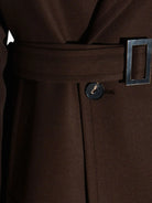 Cappotto doppiopetto di Hevò, colore marrone, con chiusura frontale a doppio petto, cintura in vita rimovibile, revers classici, tasche ad aletta, maniche lunghe e linea dritta.