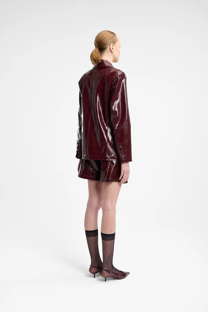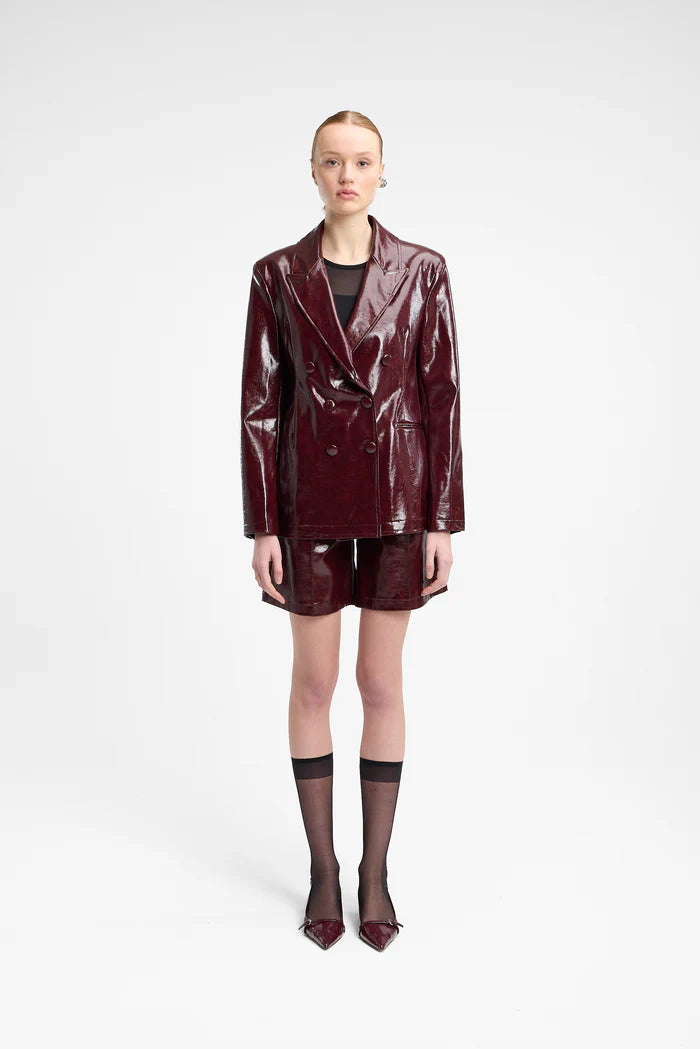 Giacca doppiopetto con collo a lancia in vinile, fit regular e fodera in satin