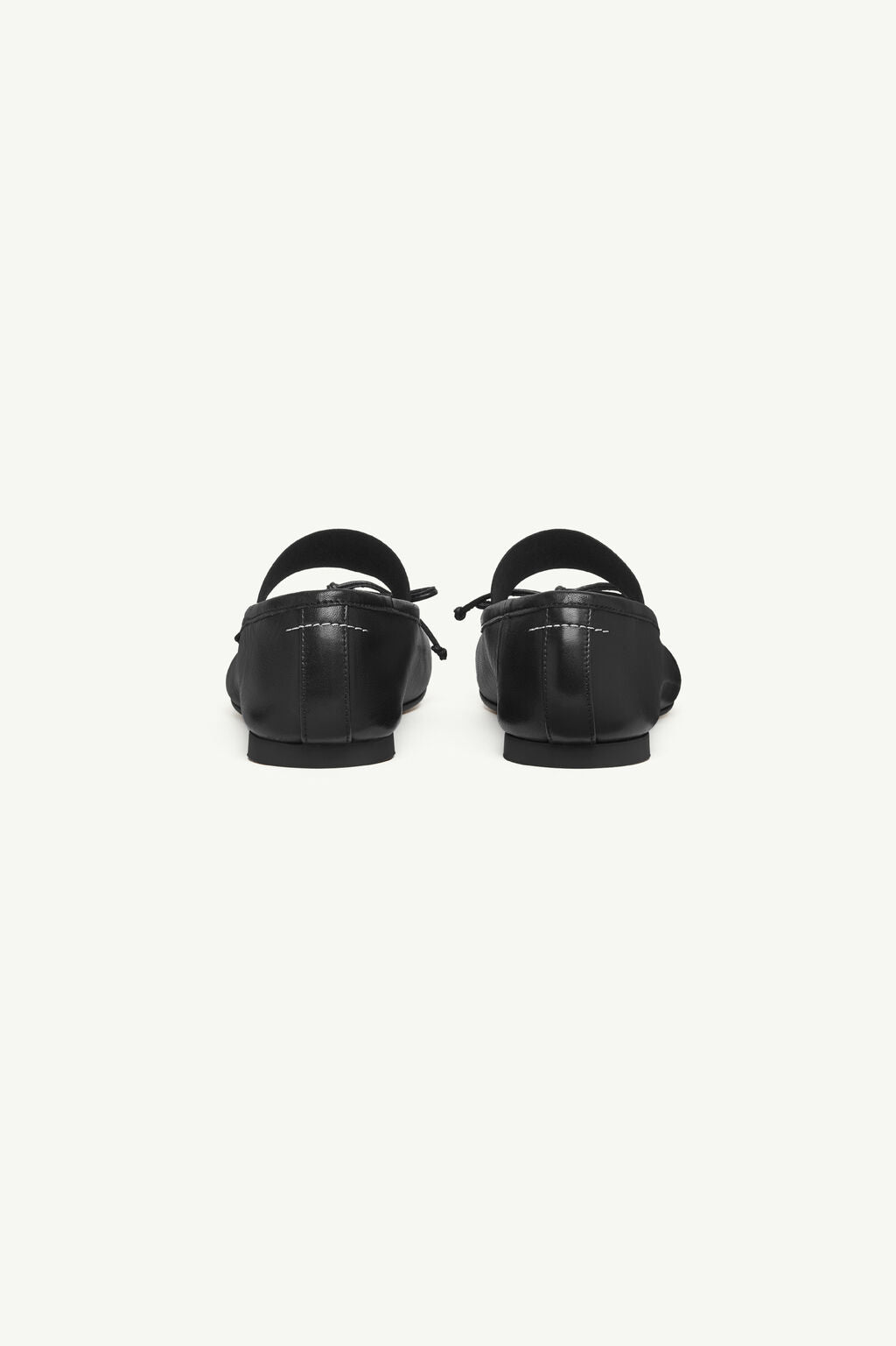 La linea anatomica MM6 aggiunge alla sua gamma le intramontabili ballerine. Caratterizzata da un tacco cilindrico tono su tono e da un elastico con firma numerica sul collo del piede, le ballerine sono realizzate a mano in nappa e presentano un fiocchetto sul davanti e l'immancabile impuntura orizzontale ricamata sul retro.
