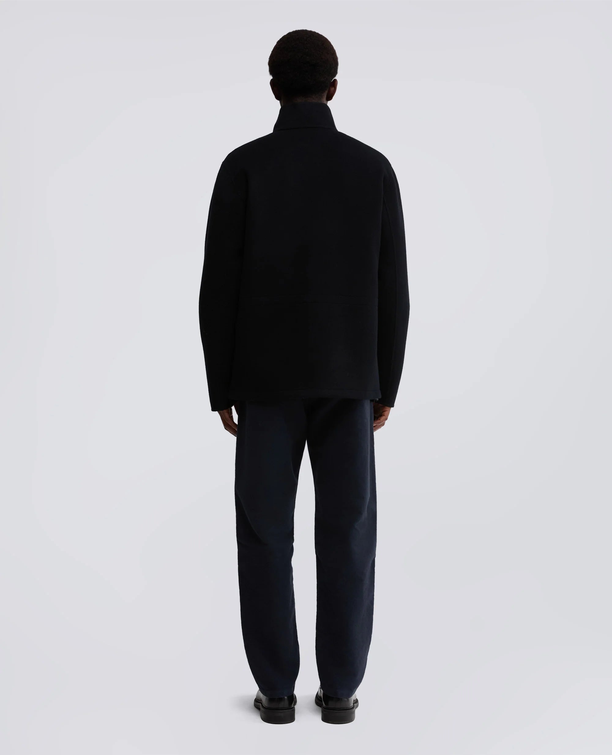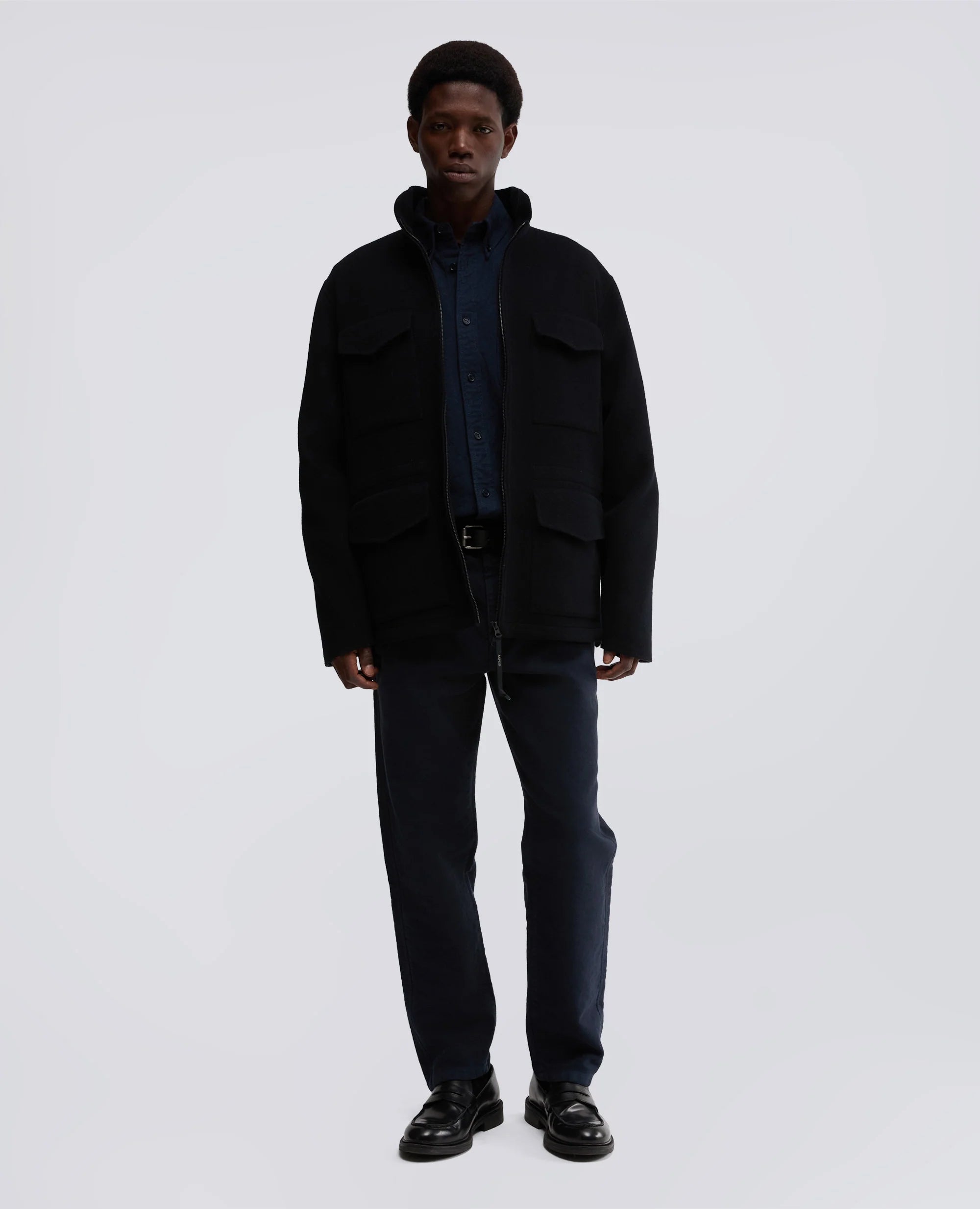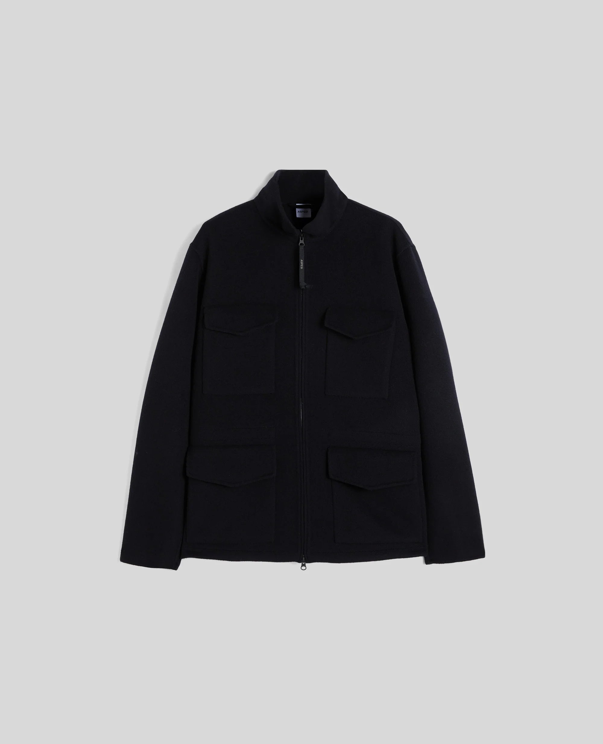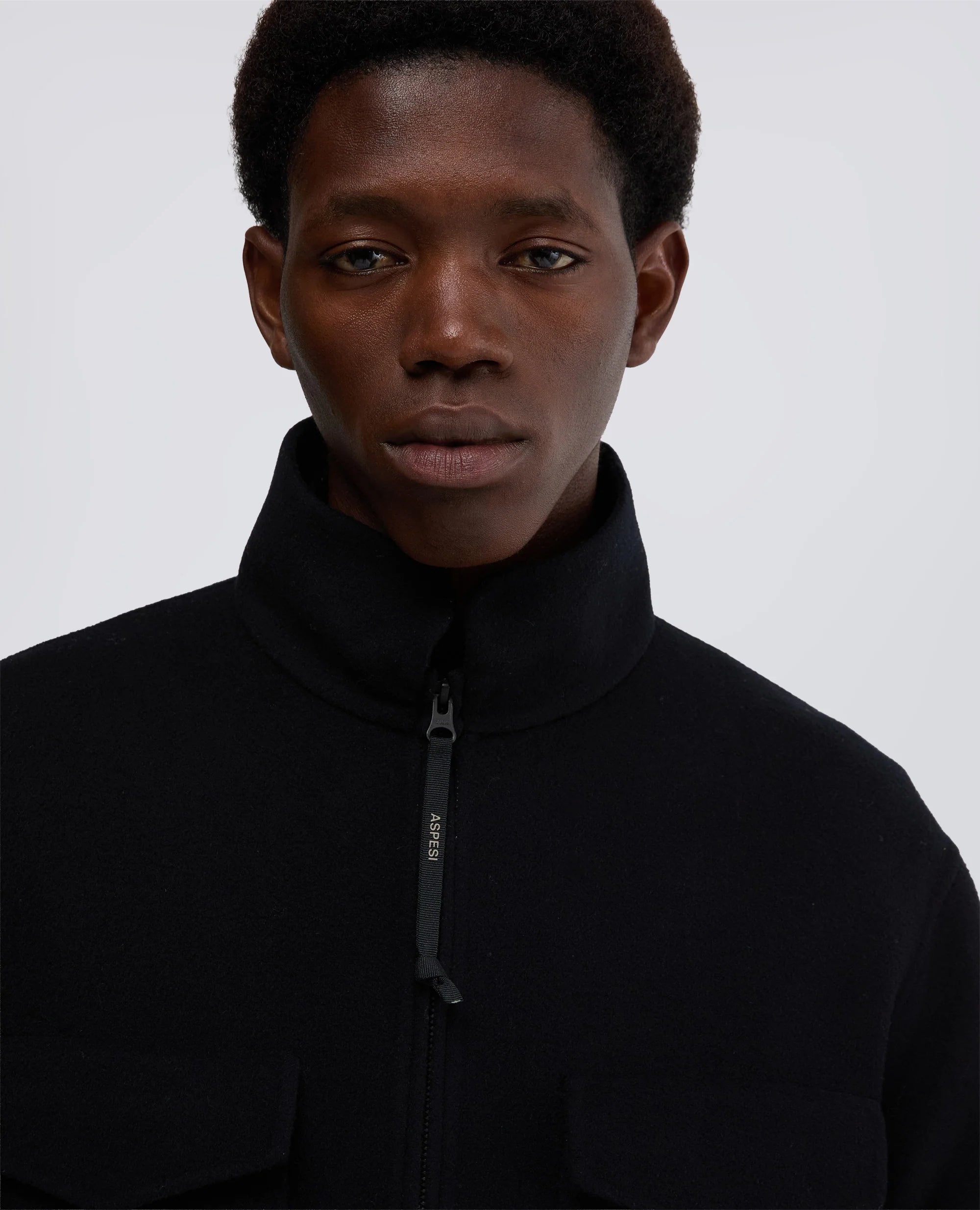 Field jacket realizzata in morbido e caldo tessuto double di lana. Il modello presenta una chiusura frontale con zip nascosta a doppio cursore, rifinito dal tirazip con logo Aspesi. Completano il design il collo in piedi e quattro tasche applicate con patta. La vita e il fondo capo sono regolabili tramite una pratica coulisse.