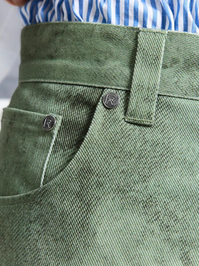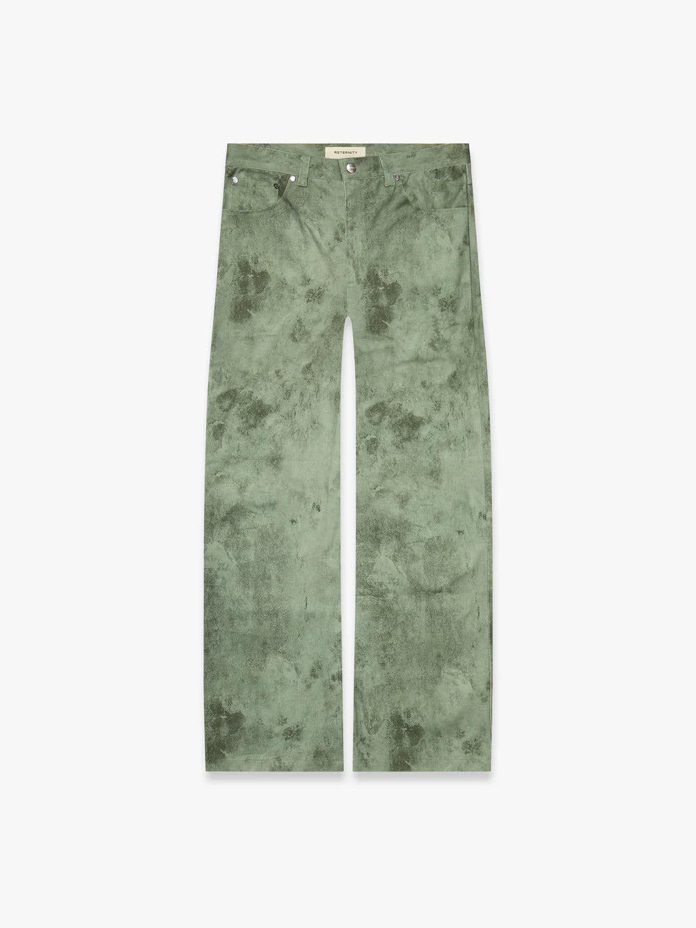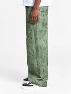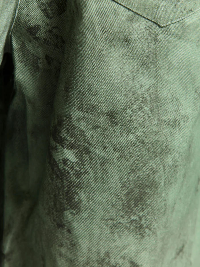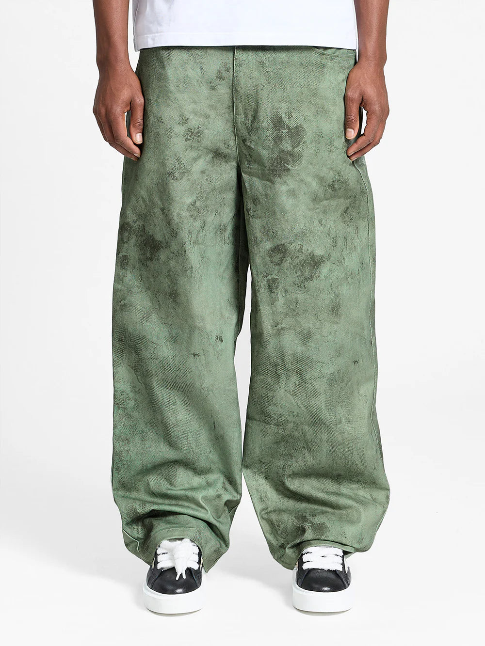 Il modello DÉLIRIA DENIM in verde è un'audace reinterpretazione del denim classico attraverso la lente della creatività più pura. Realizzato in una silhouette ampia in cotone resistente, il capo presenta la caratteristica stampa DÉLIRIA all-over: un'opera d'arte dipinta a mano e trasferita direttamente sul tessuto, che conferisce a ogni paio un carattere espressivo e pittorico. Completato da una cerniera YKK e dalla nostra iconica gruccia in metallo, per un raffinato contrasto con il caos artistico.