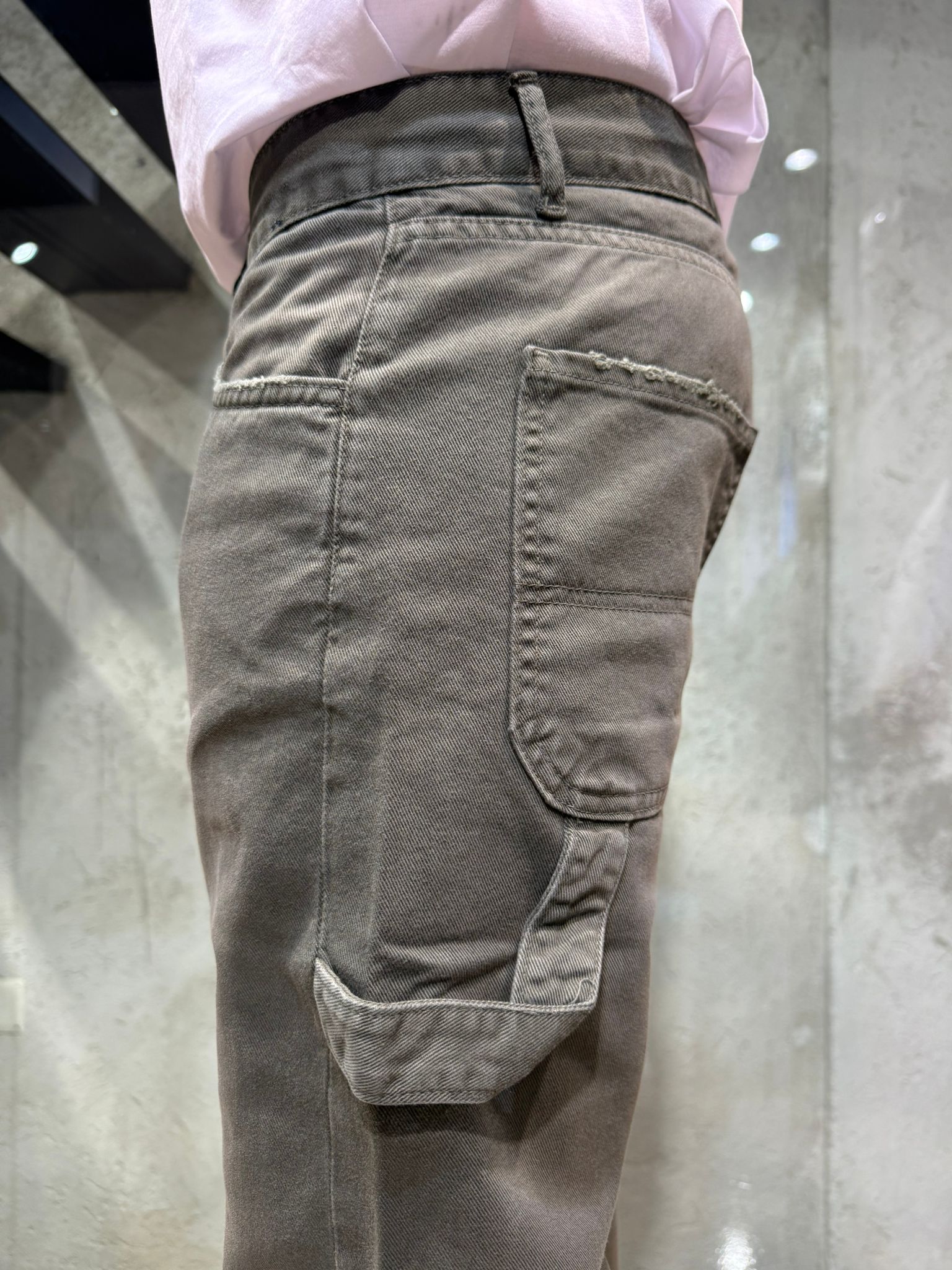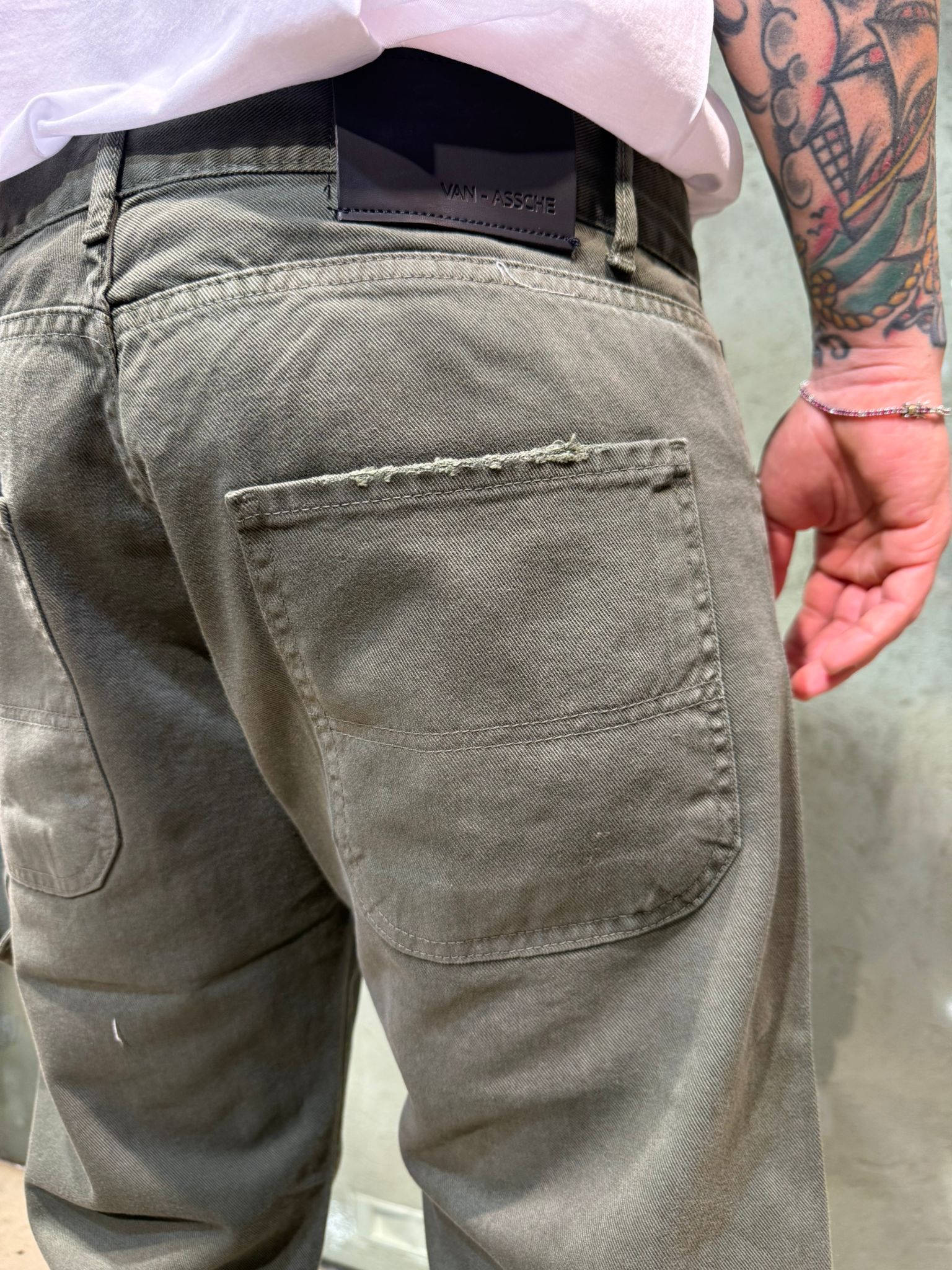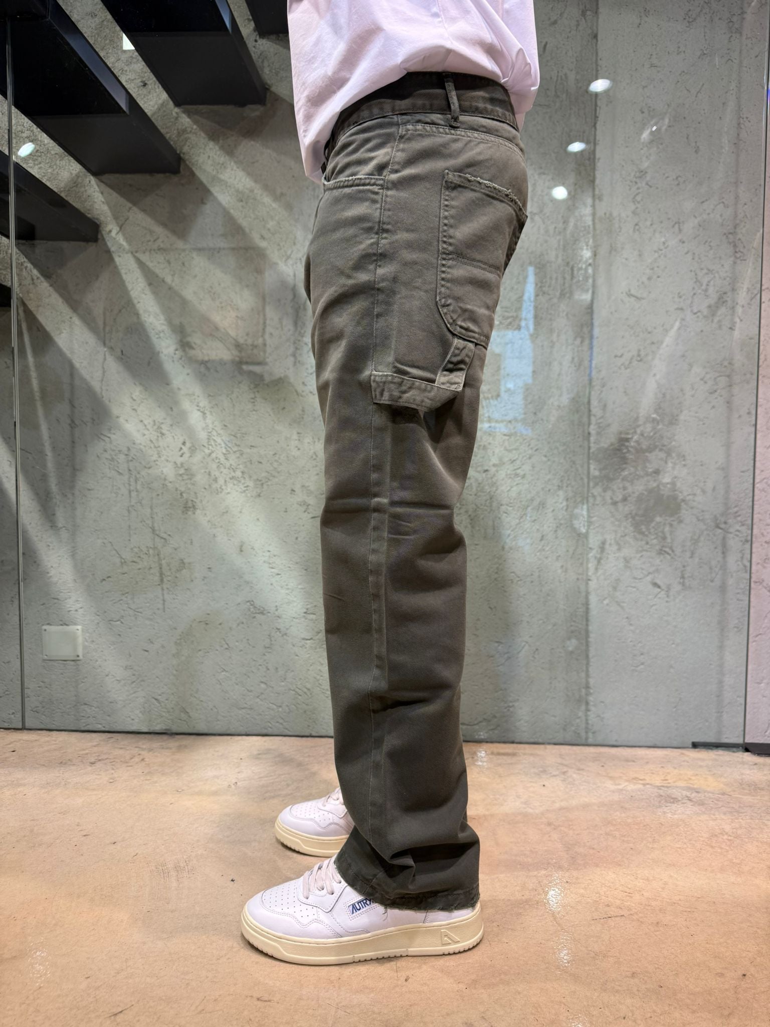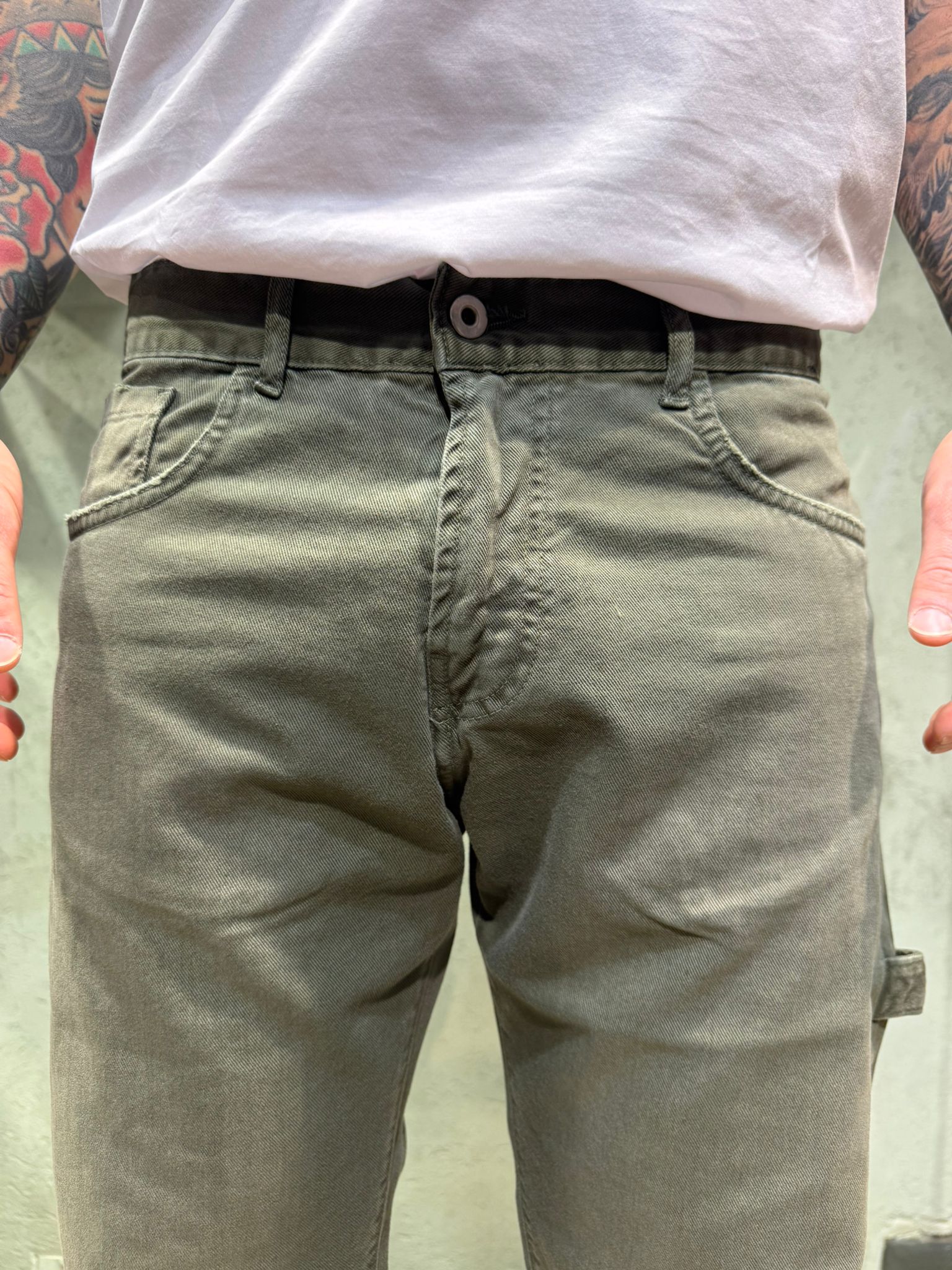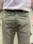 Pantalone work in cotone bull verde, sottoposto a un leggero lavaggio che ne esalta la patina naturale. La trama robusta garantisce resistenza all'usura quotidiana, mentre il passante porta martello integrato rende l'aspetto più aggressivo. Costruzione affidabile e dettagli funzionali caratterizzano questo capo, pensato per durare nel tempo senza sacrificare il comfort.