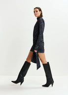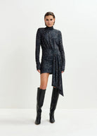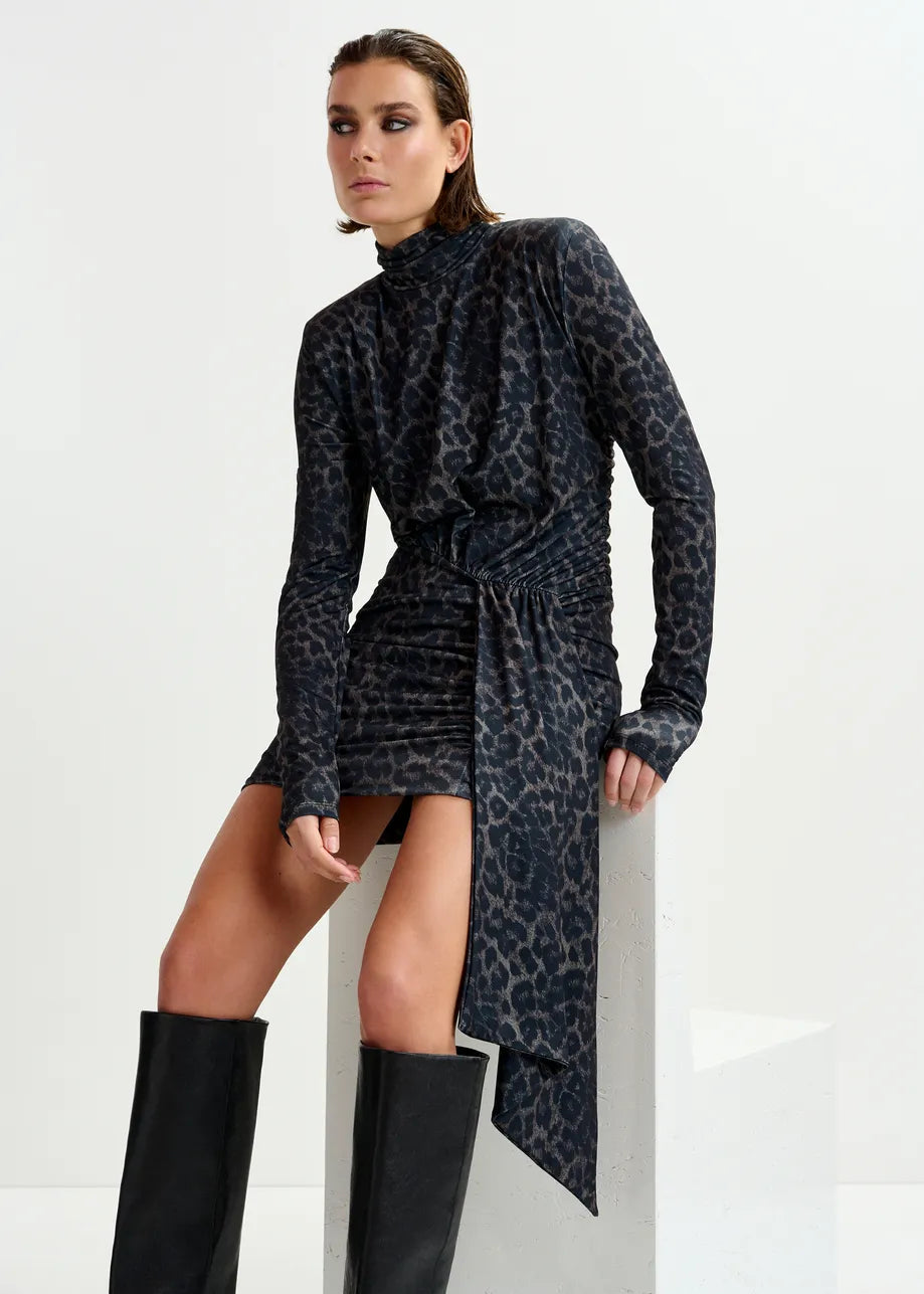 Miniabito realizzato in tessuto con stampa leopardata, vestibilità aderente che segue le forme del corpo. È caratterizzato da un collo alto strutturato e spalle imbottite per definire la figura, mentre le ruches lungo il corpo aggiungono struttura e movimento. Una pince sul davanti si estende in un pannello drappeggiato asimmetrico per una finitura scultorea. Tessuto leggermente elasticizzato di peso medio Vestibilità aderente Collo dolcevita Spalle imbottite Dettaglio di ruches con pince sul davanti Made in Italy Marrone/Nero