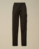 Pantaloni cargo realizzati in Chrome-R, un nylon multifilamento lucido riciclato al 100%, ottenuto da scarti di produzione e rigenerato in una nuova fibra certificata Global Recycled Standard (GRS). Il modello presenta l’iconica Lente di C.P. Company, vita con coulisse regolabile, tasche laterali e cargo con patta e bottoni automatici. Fodera in mesh. Tinti in capo con trattamento anti-goccia. Regular fit.